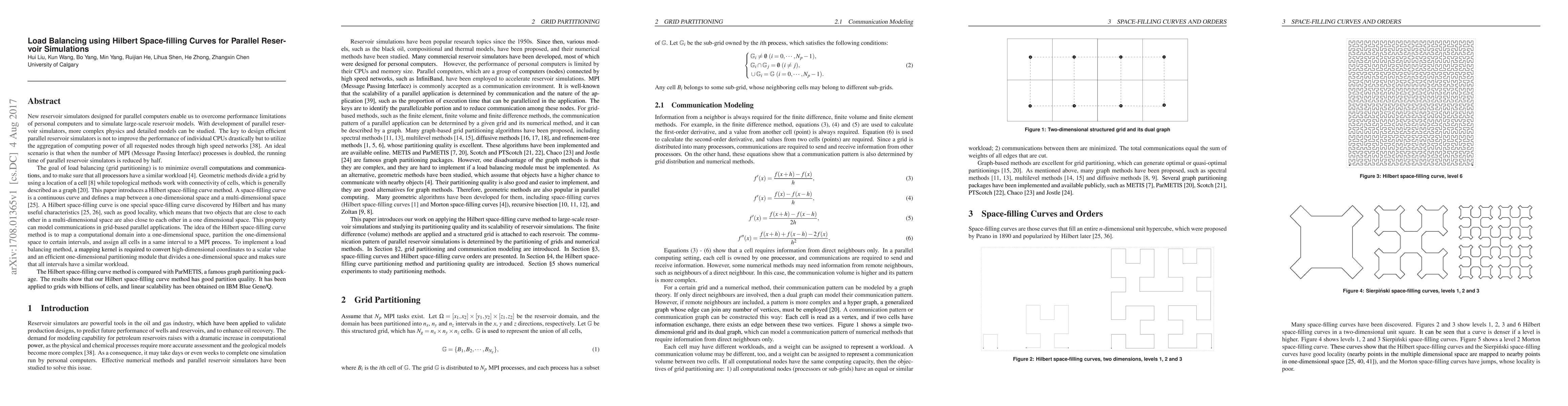 This paper proposes a Hilbert space-filling curve method for load balancing in parallel reservoir simulations, mapping high-dimensional grids into a one-dimensional space to ensure locality and similar workloads across processors. Compared to ParMETIS, the proposed method shows better partition quality and linear scalability on IBM Blue Gene/Q.