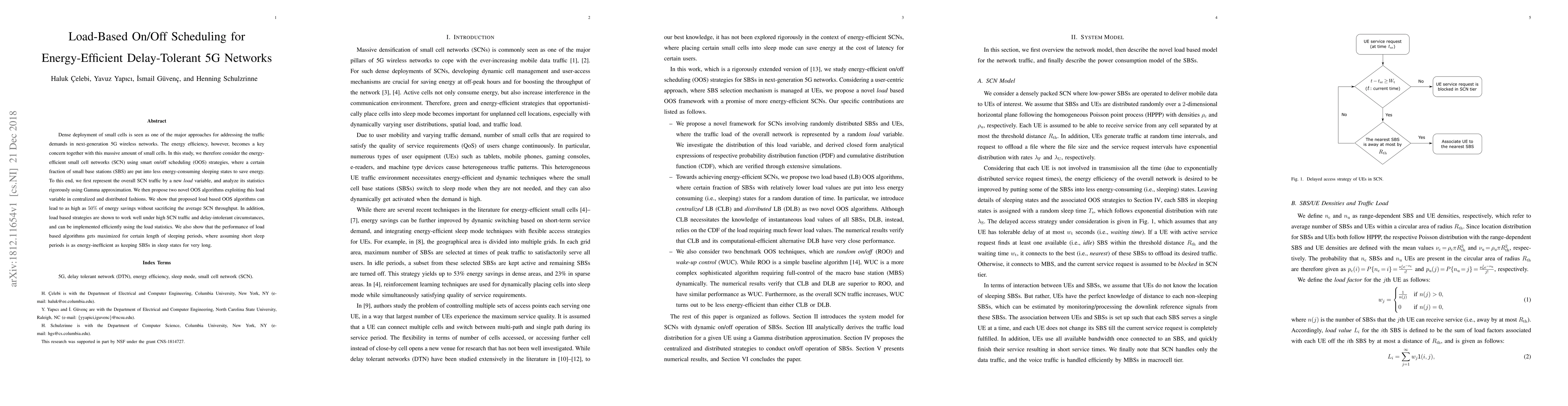 This study proposes load-based on/off scheduling algorithms for energy-efficient 5G small cell networks, achieving up to 50% energy savings without compromising throughput, while maintaining performance under high traffic and delay-intolerant conditions. The optimal sleeping periods for small base stations balance energy efficiency.