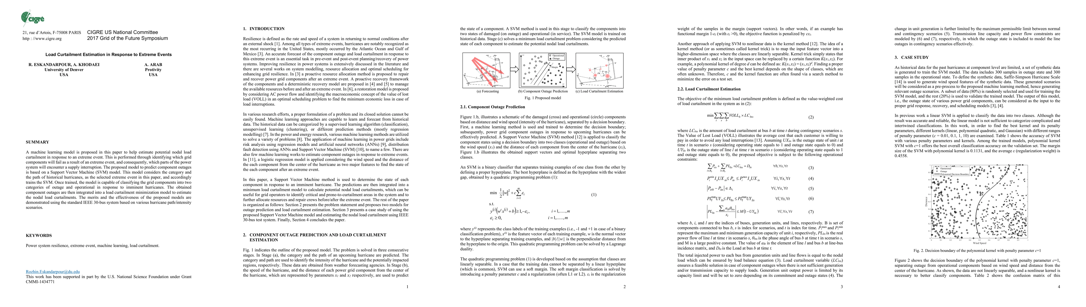 This paper proposes a machine learning model using Support Vector Machines to estimate nodal load curtailment during extreme events like hurricanes. The model identifies grid component failures and integrates this into a load curtailment minimization model, demonstrated on the IEEE 30-bus system.