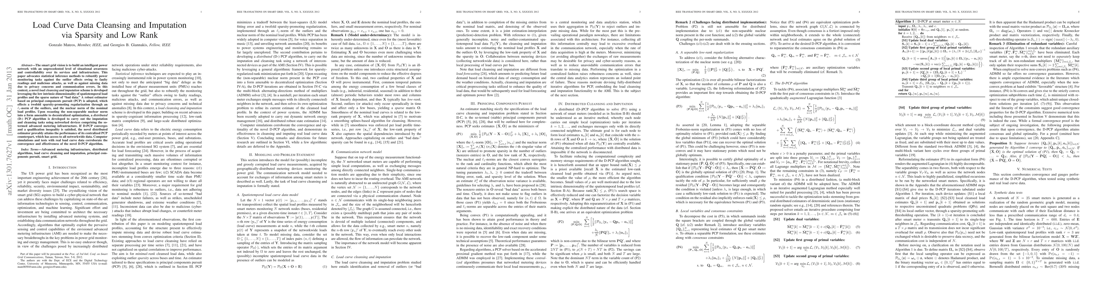 This paper proposes a novel load curve data cleansing and imputation method using statistical inference to handle outliers and missing data in smart grid monitoring. It leverages sparsity and low rank through principal components pursuit (PCP) to develop a distributed algorithm (D-PCP) that effectively performs imputation and cleansing on networked devices.