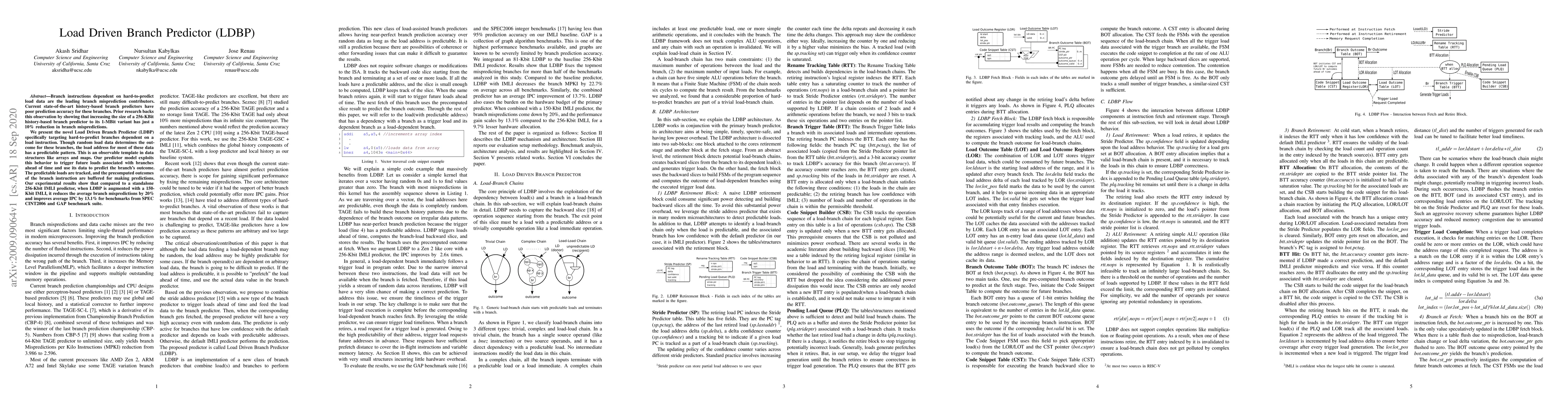 Branch instructions dependent on hard-to-predict load data are the leading branch misprediction contributors. Current state-of-the-art history-based branch predictors have poor prediction accuracy for these branches. Prior research backs this observation by showing that increasing the size of a 256-KBit history-based branch predictor to its 1-MBit variant has just a 10% reduction in branch mispredictions. We present the novel Load Driven Branch Predictor(LDBP) specifically targeting hard-to-predict branches dependent on a load instruction. Though random load data determines the outcome for these branches, the load address for most of these data has a predictable pattern. This is an observable template in data structures like arrays and maps. Our predictor model exploits this behavior to trigger future loads associated with branches ahead of time and use its data to predict the branch's outcome. The predictable loads are tracked, and the precomputed outcomes of the branch instruction are buffered for making predictions. Our experimental results show that compared to a standalone 256-Kbit IMLI predictor, when LDBP is augmented with a 150-Kbit IMLI, it reduces the average branch mispredictions by 20% and improves average IPC by 13.1% for benchmarks from SPEC CINT2006 and GAP benchmark suite.
