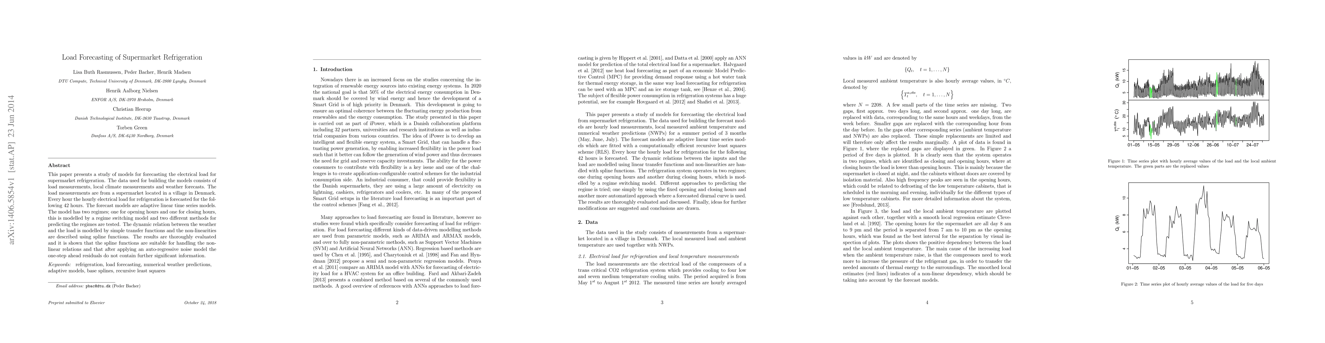 This paper develops adaptive linear time series models for forecasting supermarket refrigeration load, incorporating regime switching to differentiate between opening and closing hours. The study uses spline functions to model non-linear relationships between weather and load, achieving accurate 42-hour forecasts.