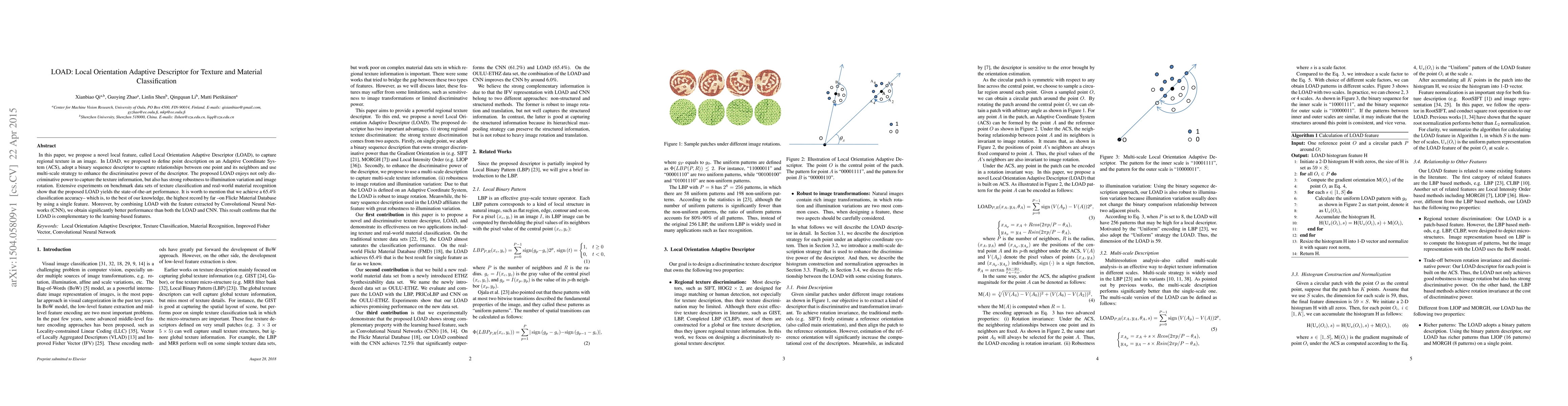 The paper introduces LOAD, a Local Orientation Adaptive Descriptor, designed for texture and material classification, leveraging an Adaptive Coordinate System and multi-scale strategy to achieve high discriminative power and robustness. Experiments show LOAD achieves state-of-the-art results, including a record 65.4% accuracy on the Flickr Material Database, and enhances performance when combined with CNN features.