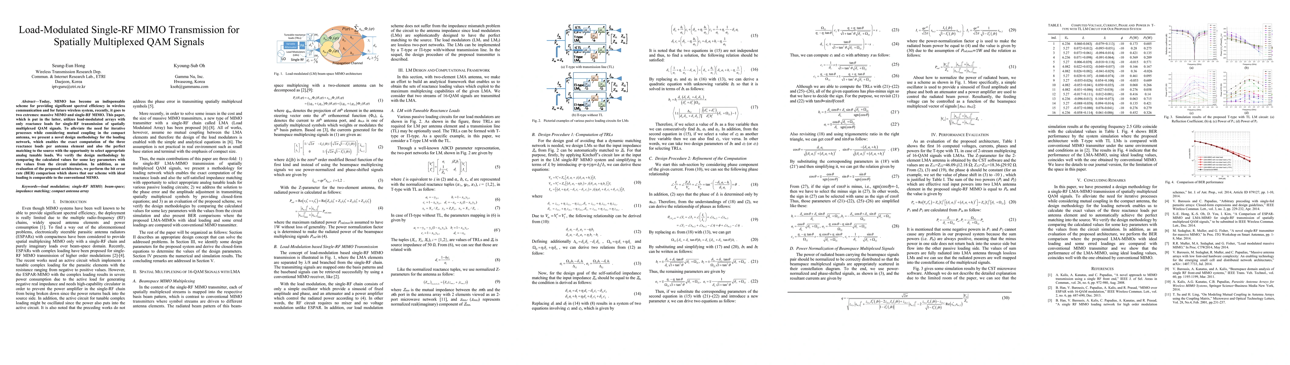 Today, MIMO has become an indispensable scheme for providing significant spectral efficiency in wireless communication and for future wireless system, recently, it goes to two extremes: massive MIMO and single-RF MIMO. This paper, which is put in the latter, utilizes load-modulated arrays with only reactance loads for single-RF transmission of spatially multiplexed QAM signals. To alleviate the need for iterative processes while considering mutual coupling in the compact antenna, we present a novel design methodology for the loading network, which enables the exact computation of the three reactance loads per antenna element and also the perfect matching to the source with the opportunity to select appropriate analog tunable loads. We verify the design methodology by comparing the calculated values for some key parameters with the values from the circuit simulation. In addition, as an evaluation of the proposed architecture, we perform the bit error rate (BER) comparison which shows that our scheme with ideal loading is comparable to the conventional MIMO.