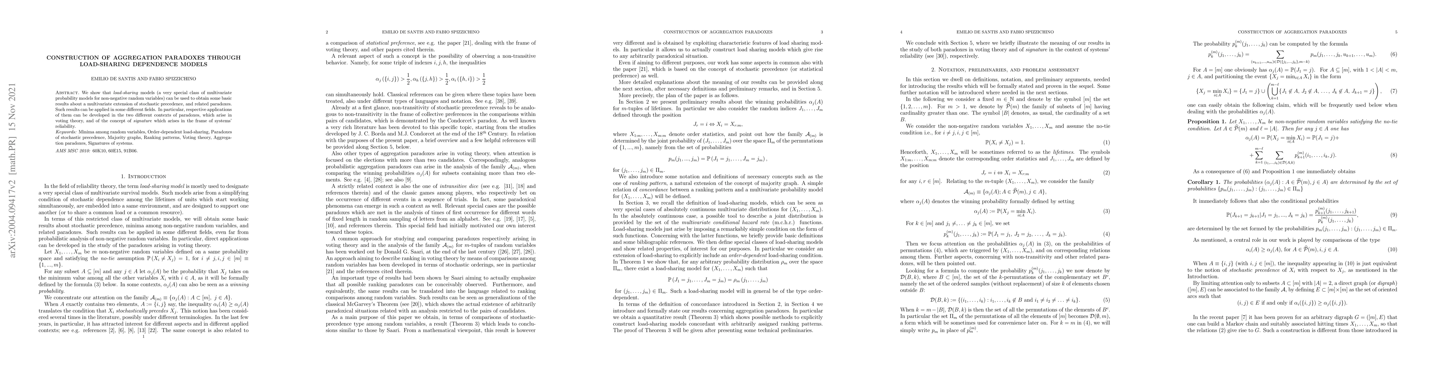 In this paper we present a study about minima among random variables, about the context of voting theory, and about paradoxes related with such topics. In the field of reliability theory, the term load-sharing model is commonly used to designate a special type of multivariate survival models. We demonstrate the effectiveness that such dependence models can have also in some other fields, such as those of interest here. Several important, and by now classic, papers have been devoted to single out and to prove general conclusions in the field of voting theory. We reformulate and achieve such conclusions by developing a method of proof, alternative to the existing ones, and completely probabilistic in nature. As main features of this method, we focus attention on ranking schemes associated to m-tuples of non-negative random variables and suitably single out a special subclass of load-sharing models. Then we show that all possible ranking schemes can be conveniently obtained by only considering such a special family of survival models. This result leads to some new insight about the construction of voting situations which give rise to all possible types of voting paradoxes. Our method and related implications will be also illustrated by means of some examples and informative remarks.