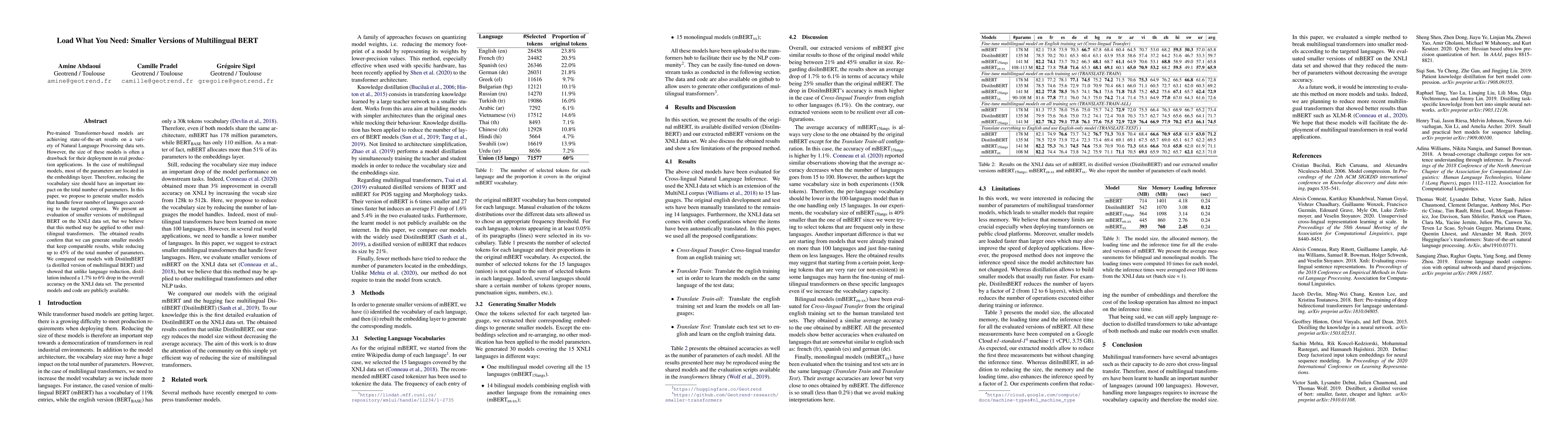 Pre-trained Transformer-based models are achieving state-of-the-art results on a variety of Natural Language Processing data sets. However, the size of these models is often a drawback for their deployment in real production applications. In the case of multilingual models, most of the parameters are located in the embeddings layer. Therefore, reducing the vocabulary size should have an important impact on the total number of parameters. In this paper, we propose to generate smaller models that handle fewer number of languages according to the targeted corpora. We present an evaluation of smaller versions of multilingual BERT on the XNLI data set, but we believe that this method may be applied to other multilingual transformers. The obtained results confirm that we can generate smaller models that keep comparable results, while reducing up to 45% of the total number of parameters. We compared our models with DistilmBERT (a distilled version of multilingual BERT) and showed that unlike language reduction, distillation induced a 1.7% to 6% drop in the overall accuracy on the XNLI data set. The presented models and code are publicly available.
