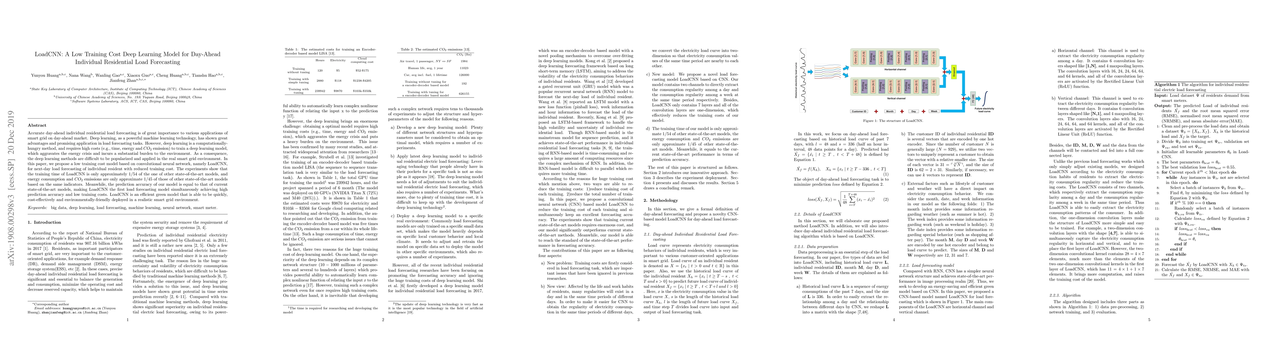 LoadCNN is a low training cost deep learning model for day-ahead individual residential load forecasting, achieving high prediction accuracy while significantly reducing training time, energy consumption, and CO2 emissions compared to state-of-the-art models. This makes it a viable and environmentally-friendly option for smart grid applications.
