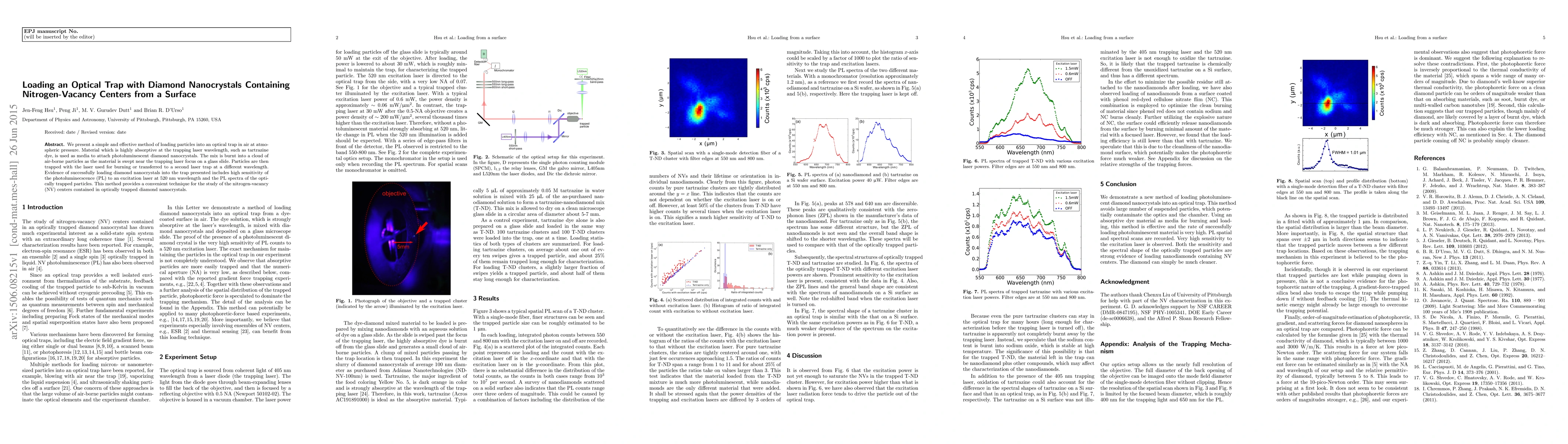 This paper describes a method for loading diamond nanocrystals with nitrogen-vacancy centers into an optical trap using absorptive media and a laser. The method demonstrates successful loading through the high sensitivity of photoluminescence to an excitation laser and the PL spectra of the trapped particles.