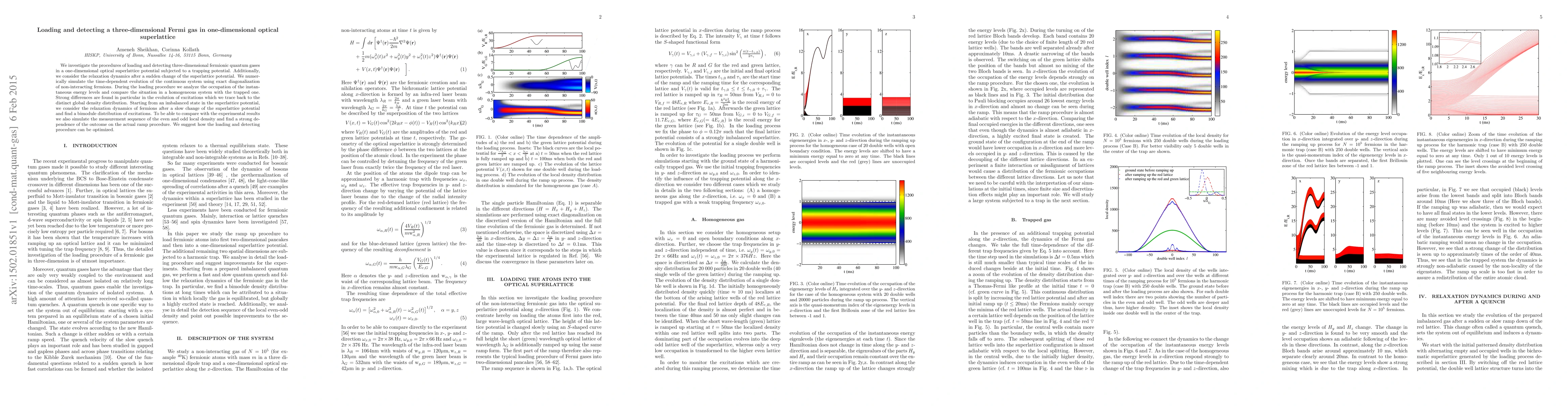 We investigate the procedures of loading and detecting three-dimensional fermionic quantum gases in a one-dimensional optical superlattice potential subjected to a trapping potential. Additionally, we consider the relaxation dynamics after a sudden change of the superlattice potential. We numerically simulate the time-dependent evolution of the continuous system using exact diagonalization of non-interacting fermions. During the loading procedure we analyze the occupation of the instantaneous energy levels and compare the situation in a homogeneous system with the trapped one. Strong differences are found in particular in the evolution of excitations which we trace back to the distinct global density distribution. Starting from an imbalanced state in the superlattice potential, we consider the relaxation dynamics of fermions after a slow change of the superlattice potential and find a bimodule distribution of excitations. To be able to compare with the experimental results we also simulate the measurement sequence of the even and odd local density and find a strong dependence of the outcome on the actual ramp procedure. We suggest how the loading and detecting procedure can be optimized.