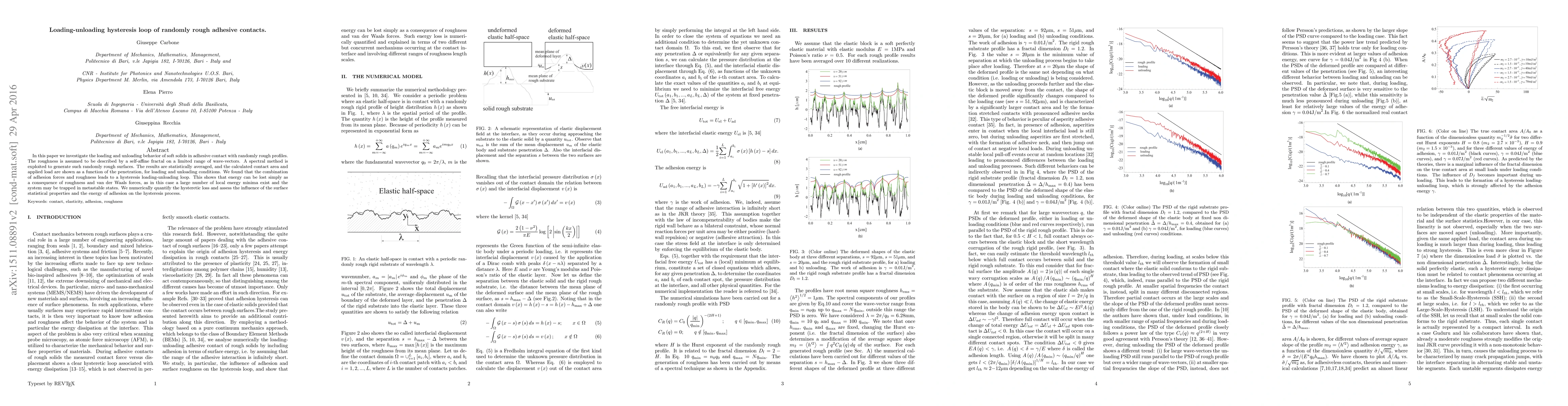 This paper investigates the loading-unloading hysteresis in adhesive contacts between soft solids with randomly rough surfaces, revealing that adhesion forces and surface roughness lead to energy loss and hysteresis loops due to metastable states. The study quantifies hysteretic loss and assesses the impact of surface roughness and adhesion energy.