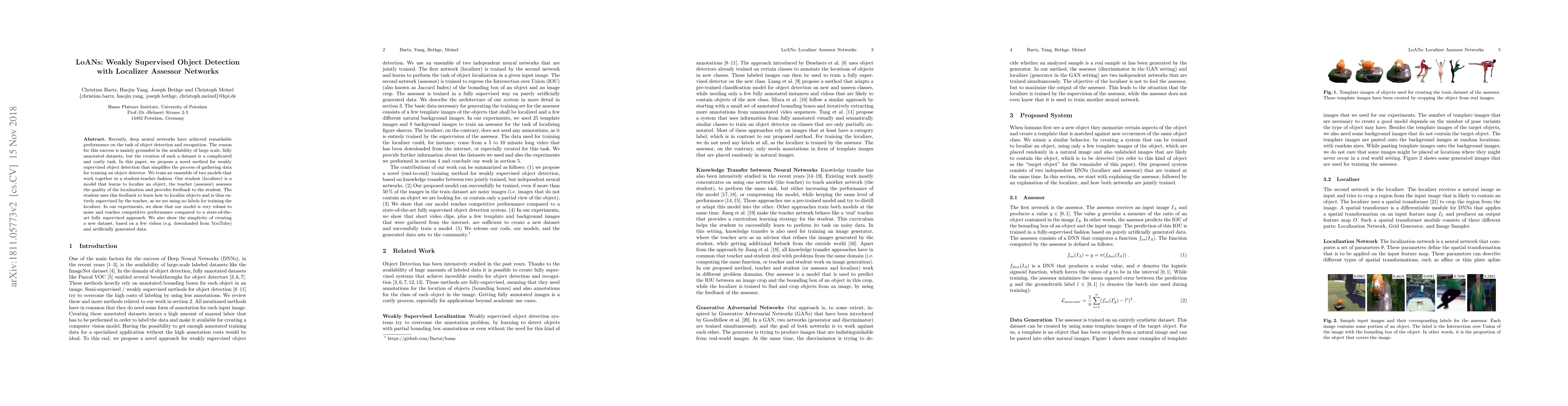 Recently, deep neural networks have achieved remarkable performance on the task of object detection and recognition. The reason for this success is mainly grounded in the availability of large scale, fully annotated datasets, but the creation of such a dataset is a complicated and costly task. In this paper, we propose a novel method for weakly supervised object detection that simplifies the process of gathering data for training an object detector. We train an ensemble of two models that work together in a student-teacher fashion. Our student (localizer) is a model that learns to localize an object, the teacher (assessor) assesses the quality of the localization and provides feedback to the student. The student uses this feedback to learn how to localize objects and is thus entirely supervised by the teacher, as we are using no labels for training the localizer. In our experiments, we show that our model is very robust to noise and reaches competitive performance compared to a state-of-the-art fully supervised approach. We also show the simplicity of creating a new dataset, based on a few videos (e.g. downloaded from YouTube) and artificially generated data.