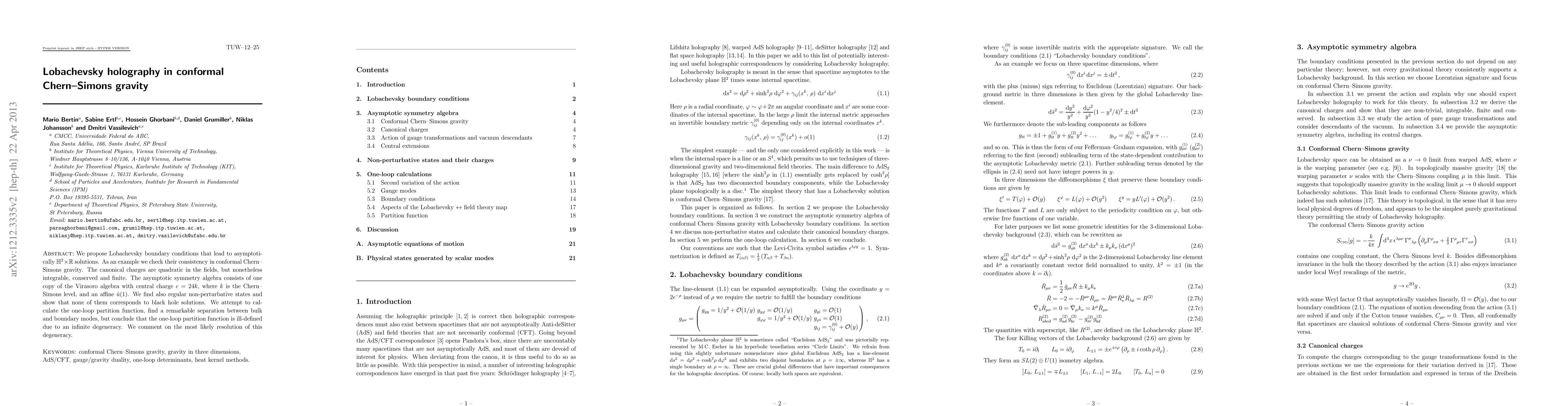 We propose Lobachevsky boundary conditions that lead to asymptotically H^2xR solutions. As an example we check their consistency in conformal Chern-Simons gravity. The canonical charges are quadratic in the fields, but nonetheless integrable, conserved and finite. The asymptotic symmetry algebra consists of one copy of the Virasoro algebra with central charge c=24k, where k is the Chern-Simons level, and an affine u(1). We find also regular non-perturbative states and show that none of them corresponds to black hole solutions. We attempt to calculate the one-loop partition function, find a remarkable separation between bulk and boundary modes, but conclude that the one-loop partition function is ill-defined due to an infinite degeneracy. We comment on the most likely resolution of this degeneracy.