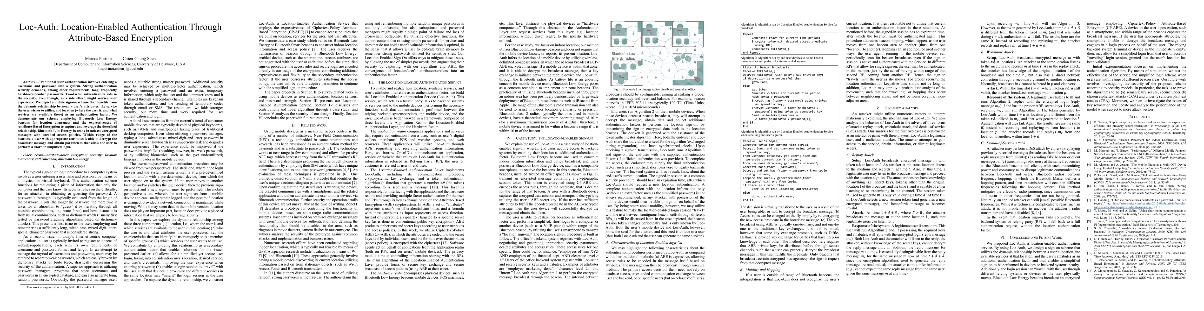 The paper proposes Loc-Auth, a mobile authentication scheme that uses location-based attributes and Attribute-Based Encryption to enhance security while improving user experience. It employs Bluetooth Low Energy beacons for location awareness and allows users with relevant attributes to decrypt messages and perform simplified logins.