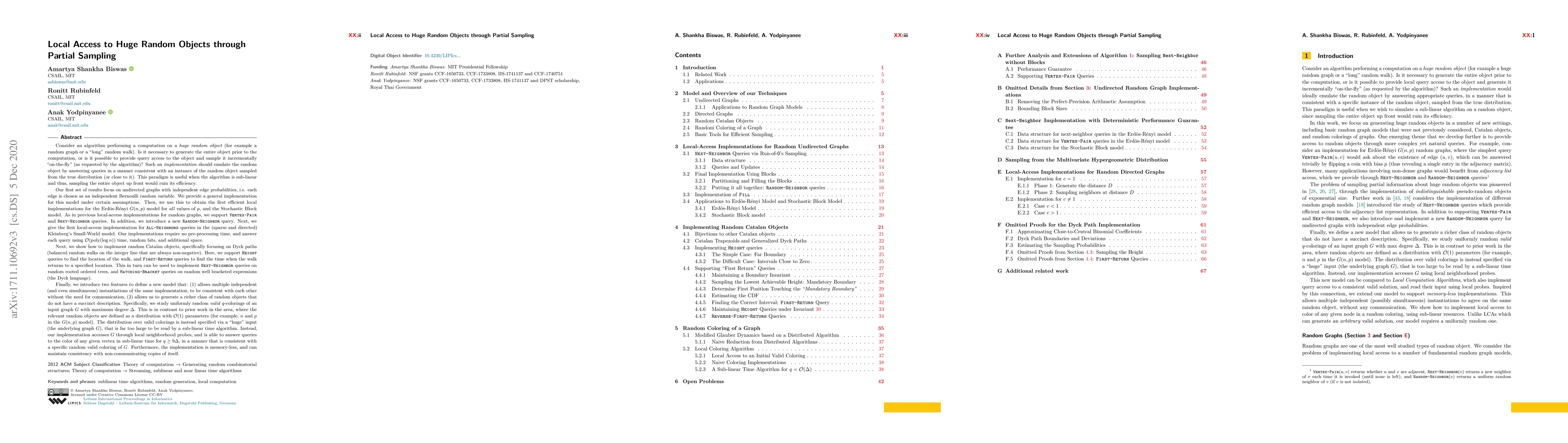 This paper explores efficient local access methods for huge random objects through incremental sampling, focusing on undirected graphs, Catalan objects, and random colorings. It provides implementations for the Erdos-Renyi and Stochastic Block models, and introduces new queries for random Catalan objects and random $q$-colorings, all while maintaining consistency across multiple instances.