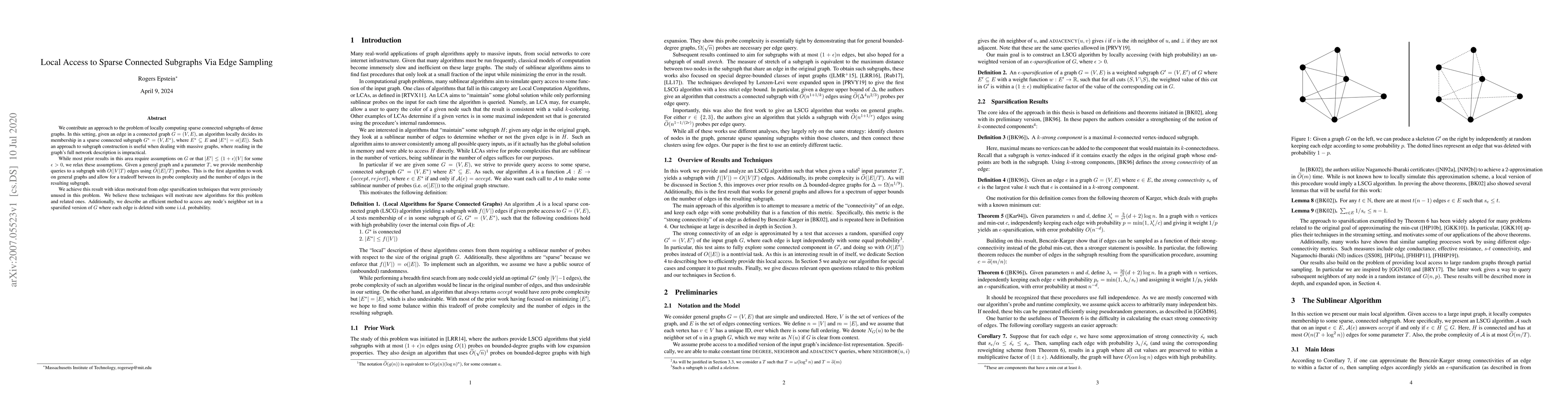This paper presents an algorithm for locally determining membership of edges in sparse connected subgraphs of dense graphs, without requiring restrictive assumptions on the graph structure. It achieves a trade-off between probe complexity and subgraph size, using novel edge sparsification techniques.
