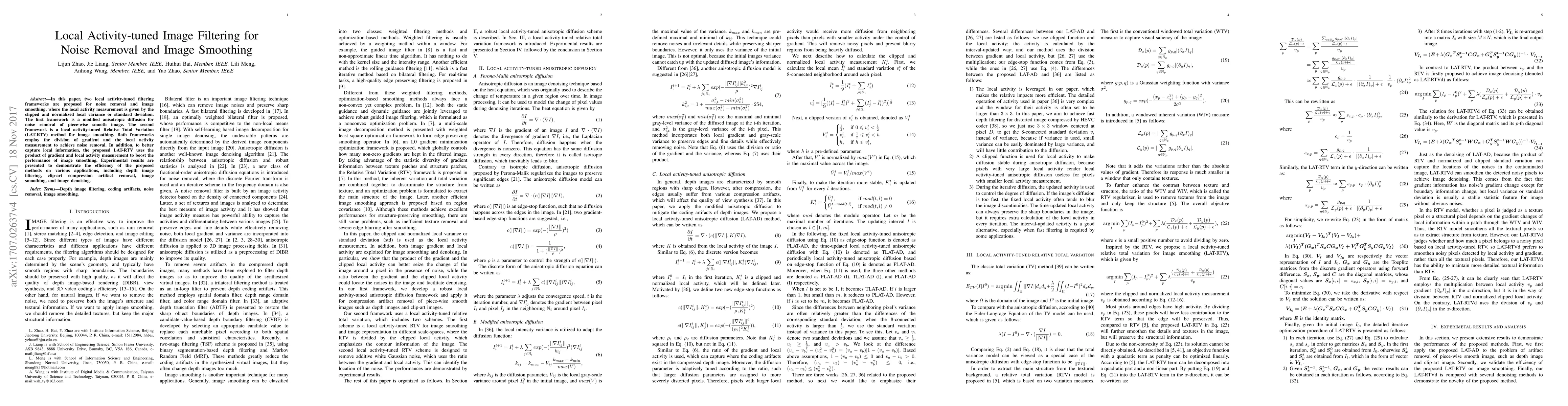 In this paper, two local activity-tuned filtering frameworks are proposed for noise removal and image smoothing, where the local activity measurement is given by the clipped and normalized local variance or standard deviation. The first framework is a modified anisotropic diffusion for noise removal of piece-wise smooth image. The second framework is a local activity-tuned Relative Total Variation (LAT-RTV) method for image smoothing. Both frameworks employ the division of gradient and the local activity measurement to achieve noise removal. In addition, to better capture local information, the proposed LAT-RTV uses the product of gradient and local activity measurement to boost the performance of image smoothing. Experimental results are presented to demonstrate the efficiency of the proposed methods on various applications, including depth image filtering, clip-art compression artifact removal, image smoothing, and image denoising.