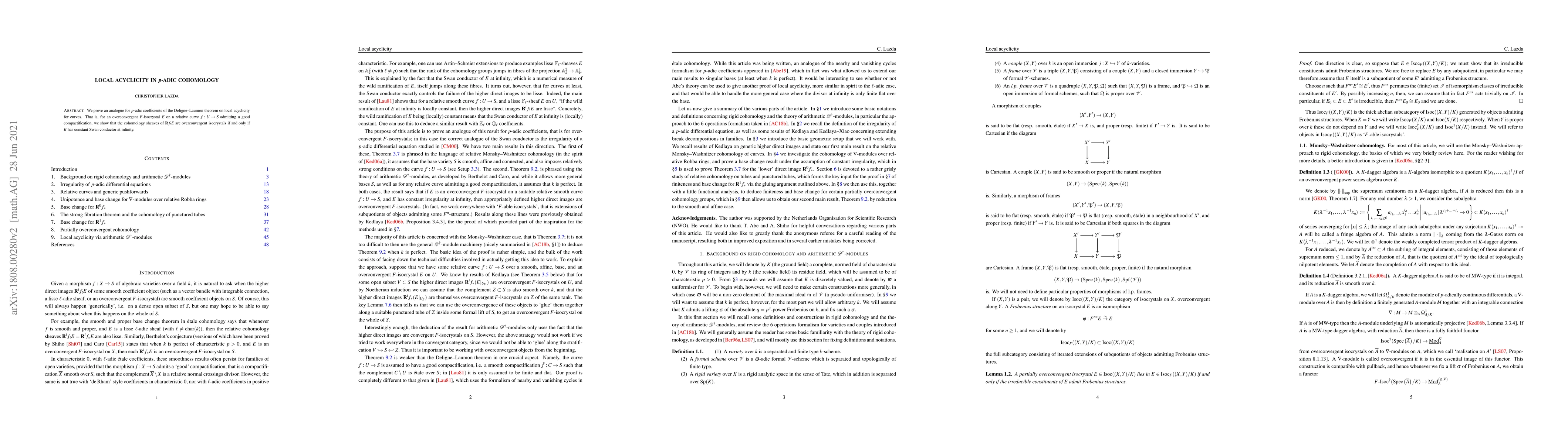 This paper proves a $p$-adic analogue of the Deligne-Laumon theorem on local acyclicity for curves, showing that the cohomology sheaves of overconvergent $F$-isocrystals on a relative curve with good compactification are overconvergent isocrystals if $E$ has constant Swan conductor at infinity.