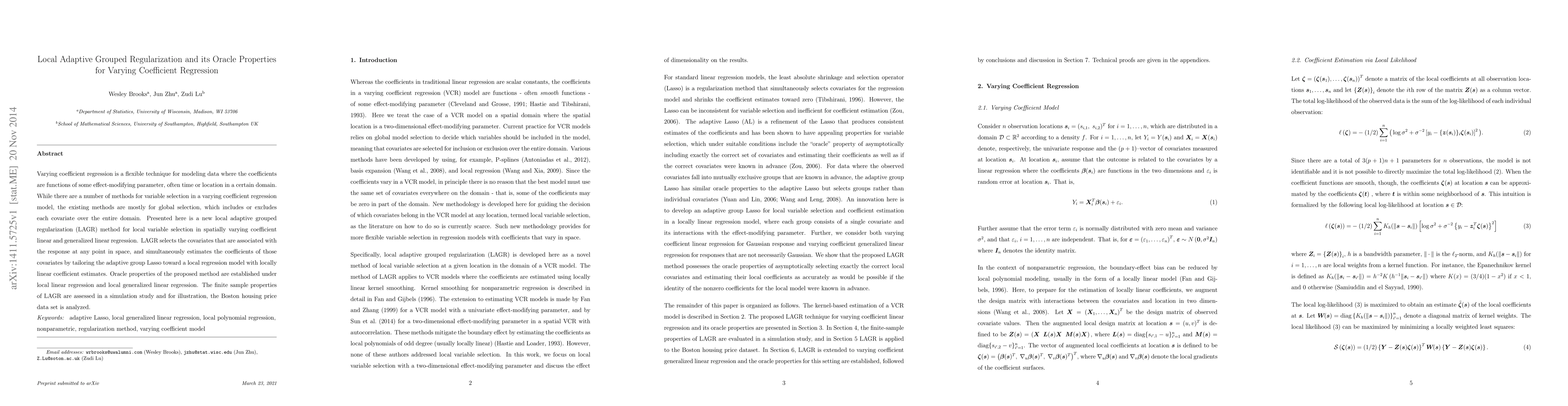 This paper introduces a local adaptive grouped regularization (LAGR) method for spatially varying coefficient regression, enabling local variable selection and coefficient estimation. The LAGR method demonstrates oracle properties under local linear and generalized linear regression, and its performance is validated through simulations and an application to the Boston housing price dataset.