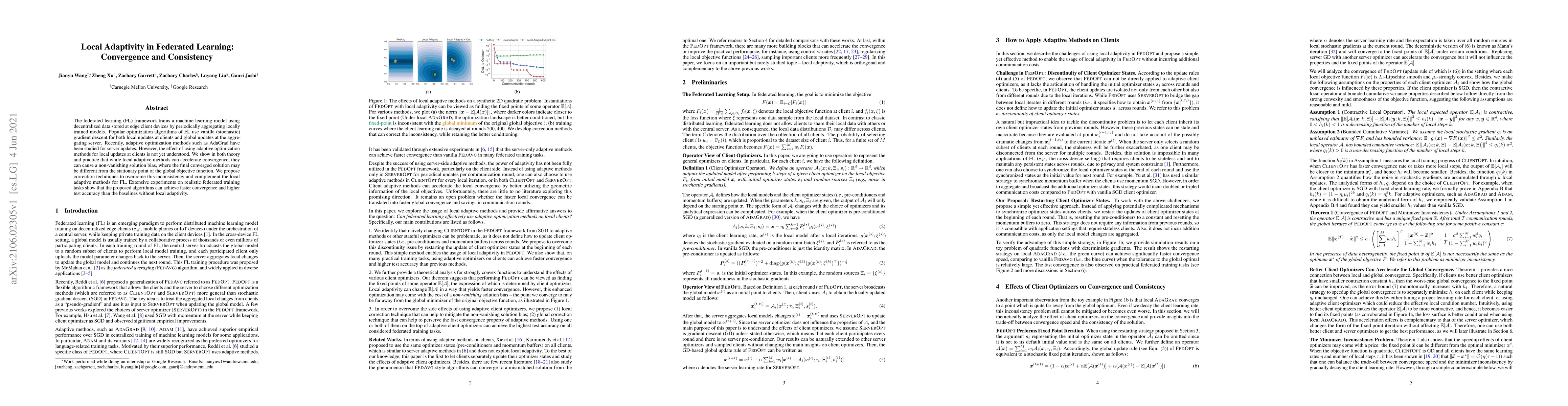 This paper explores the use of adaptive optimization methods for local updates in federated learning, demonstrating that while they can accelerate convergence, they may introduce a non-vanishing solution bias. The authors propose correction techniques to mitigate this inconsistency, achieving faster convergence and higher test accuracy in experiments.