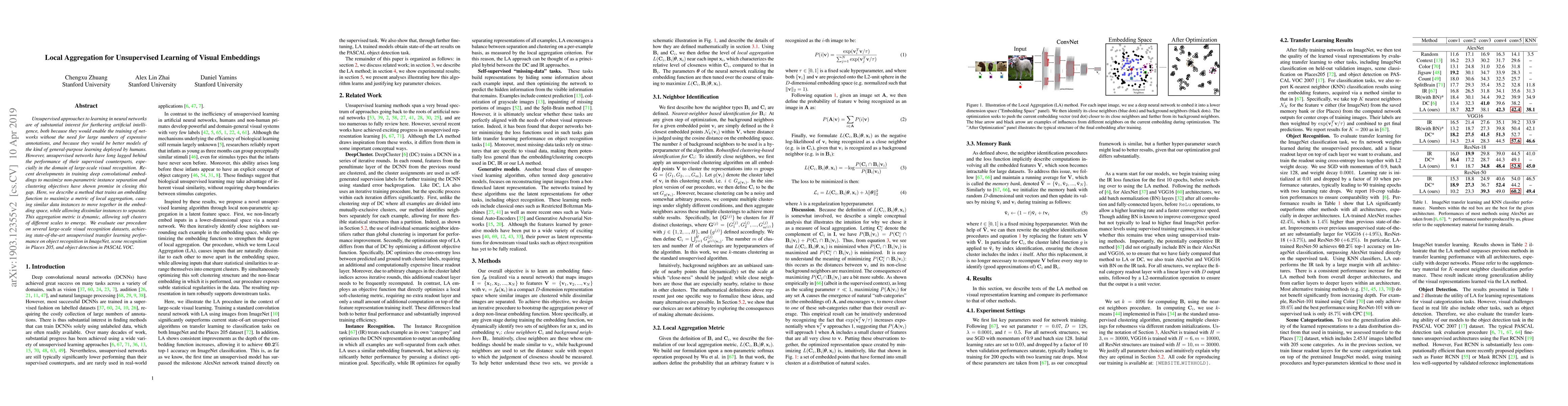 This paper proposes a method for unsupervised learning of visual embeddings through local aggregation, achieving state-of-the-art performance in visual recognition tasks on ImageNet, Places 205, and PASCAL VOC by dynamically clustering similar data instances in the embedding space.
