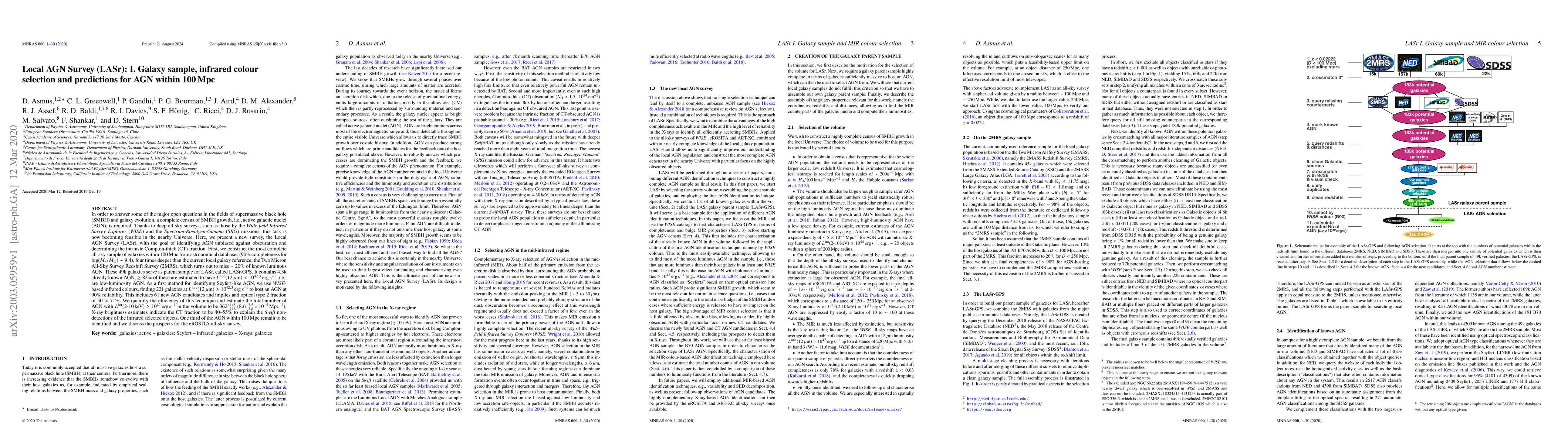 In order to answer some of the major open questions in the fields of supermassive black hole (SMBH) and galaxy evolution, a complete census of SMBH growth, i.e., active galactic nuclei (AGN), is required. Thanks to deep all-sky surveys, such as those by the Wide-field Infrared Survey Explorer (WISE) and the Spectrum-Roentgen-Gamma (SRG) missions, this task is now becoming feasible in the nearby Universe. Here, we present a new survey, the Local AGN Survey (LASr), with the goal of identifying AGN unbiased against obscuration and determining the intrinsic Compton-thick (CT) fraction. First, we construct the most complete all-sky sample of galaxies within 100 Mpc from astronomical databases (90% completeness for log M_star/M_sun ~9.4), four times deeper than the current local galaxy reference, the Two Micron All-Sky Survey Redshift Survey (2MRS), which turns out to miss 20% of known luminous AGN. These 49k galaxies serve as parent sample for LASr, called LASr-GPS. It contains 4.3k already known AGN, >=82% of these are estimated to have L(12um) < 10^42.3 erg/s, i.e., are low-luminosity AGN. As a first method for identifying Seyfert-like AGN, we use WISE-based infrared colours, finding 221 galaxies at L(12um) >= 10^42.3 erg/s to host an AGN at 90% reliability, This includes 61 new AGN candidates and implies and optical type 2 fraction of 50 to 71%. We quantify the efficiency of this technique and estimate the total number of AGN with L_int(2-10 keV) >= 10^42 erg/s in the volume to be 362^+145_-116 (8.6^+3.5_-2.8 10^-5 Mpc^-3). X-ray brightness estimates indicate the CT fraction to be 40-55% to explain the Swift non-detections of the infrared selected objects. One third of the AGN within 100 Mpc remain to be identified and we discuss the prospects for the eROSITA all-sky survey.