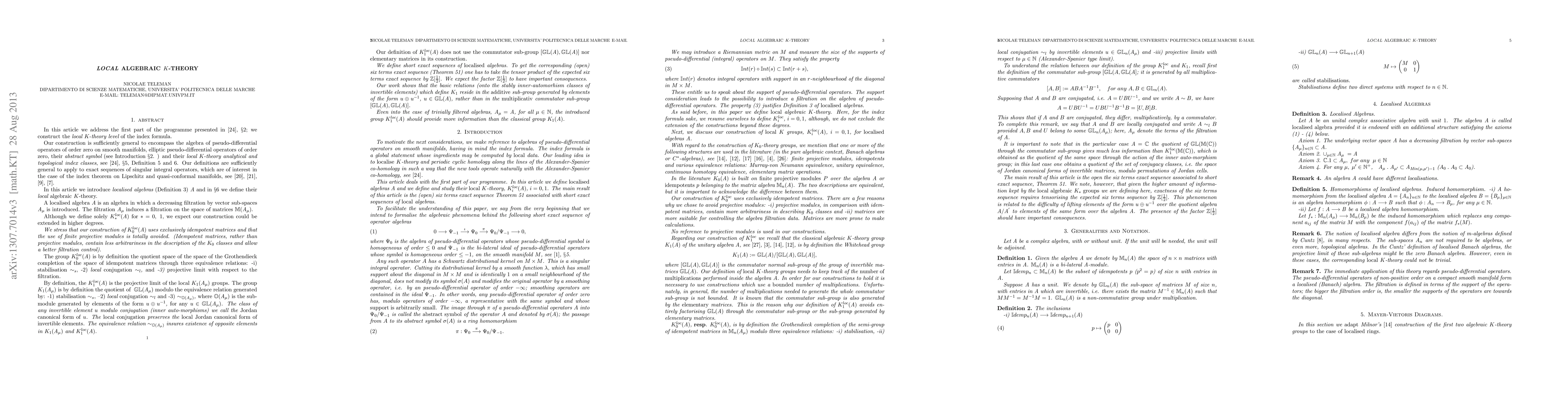 In this article we address the first part of the programme presented in \cite{Teleman_arXiv_III}, \S 2; we construct the local $K$- theory level of the index formula. Our construction is sufficiently general to encompass the algebra of pseudo-differential operators of order zero on smooth manifolds, elliptic pseudo-differential operators of order zero, their abstract symbol (see Introduction \S 2.) and their local $K$- theory analytical and topological index classes, see \cite{Teleman_arXiv_III}, \S 5, Definition 5 and 6. Our definitions are sufficiently general to apply to exact sequences of singular integral operators, which are of interest in the case of the index theorem on Lipschitz and quasi-conformal manifolds, see \cite{Teleman_IHES}, \cite{Teleman_Acta}, \cite{Donaldson_Sullivan}, \cite{Connes_Sullivan_Teleman}. In this article we introduce localised algebras (Definition 3) $\mathit{A}$ and in \S 6 we define their local algebraic $K$-theory. A localised algebra $\mathit{A}$ is an algebra in which a decreasing filtration by vector sub-spaces $\mathit{A}_{\mu}$ is introduced. The filtration $\mathit{A}_{\mu}$ induces a filtration on the space of matrices $\mathbb{M}(\mathit{A}_{\mu})$. Although we define solely $K^{loc}_{\ast}(\mathit{A})$ for $\ast= 0, \; 1$, we expect our construction could be extended in higher degrees. We stress that our construction of $K^{loc}_{0}(\mathit{A})$ uses exclusively idempotent matrices and that the use of finite projective modules is totally avoided. (Idempotent matrices, rather than projective modules, contain less arbitrariness in the description of the $K_{0}$ classes and allow a better filtration control). The group $K^{loc}_{0}(\mathit{A})$ is by definition the quotient space of the space of the Grothendieck completion of the space of idempotent matrices through three equivalence relations: -i) stabilisation $\sim_{s}$, -2) local conjugation $\sim_{l}$, {\em and} -3) projective limit with respect to the filtration. By definition, the $K_{1}^{loc} (\mathit{A})$ is the projective limit of the local $K_{1}(\mathit{A}_{\mu})$ groups. The group $K_{1}(\mathit{A}_{\mu})$ is by definition the quotient of $\mathbb{GL}(\mathit{A}_{\mu})$ modulo the equivalence relation generated by: -1) stabilisation $\sim_{s}$, --2) local conjugation $\sim_{l}$ and -3) $\sim_{\mathbb{O}(\mathit{A}_{\mu})}$, where $\mathbb{O}(\mathit{A}_{\mu})$ is the sub-module generated by elements of the form $ u \oplus u^{-1} $, for any $u \in \mathbb{GL}(\mathit{A}_{\mu})$. The class of any invertible element $u$ modulo conjugation (inner auto-morphisms) we call the Jordan canonical form of $u$. The local conjugation preserves the local Jordan canonical form of invertible elements. The equivalence relation $\sim_{\mathbb{O}(\mathit{A}_{\mu})}$ insures existence of opposite elements in $K_{1}(\mathit{A}_{\mu})$ and $K_{1}^{loc}(\mathit{A})$. Our definition of $K^{loc}_{1}(\mathit{A})$ does not use the commutator sub-group $[\mathbb{GL}(\mathit{A}), \mathbb{GL}(\mathit{A})]$ nor elementary matrices in its construction. We define short exact sequences of localised algebras. To get the corresponding (open) six terms exact sequence (Theorem 51) one has to take the tensor product of the expected six terms exact sequence by $\mathbb{Z}[\frac{1}{2}]$. We expect the factor $\otimes_{\mathbb{Z}[\frac{1}{2}}]$ to have important consequences. Our work shows that the basic structure of $K_{1}$ resides in the {\em additive} sub-group generated by elements of the form $u \oplus u^{-1}$, $u \in \mathbb{GL}(\mathit{A})$, rather than in the {\em multiplicativ} commutator sub-group $[\mathbb{GL}(\mathit{A}), \mathbb{GL}(\mathit{A})]$. Even into the case of trivially filtered algebras, $\mathit{A}_{\mu} = \mathit{A}$, for all $\mu \in \mathbb{N}$, the introduced group $K^{loc}_{1}(\mathit{A})$ should provide more information than the classical group $K_{1}(\mathit{A})$.