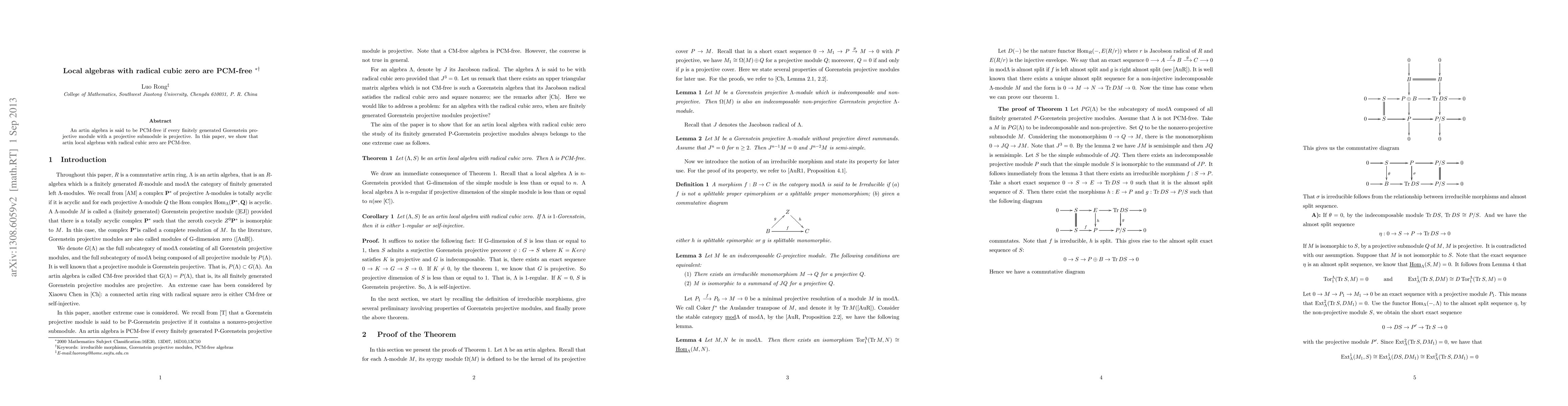 Summary: This paper demonstrates that local Artin algebras where the radical cubed equals zero are PCM-free, meaning no finitely generated Gorenstein projective module with a projective submodule is non-projective.