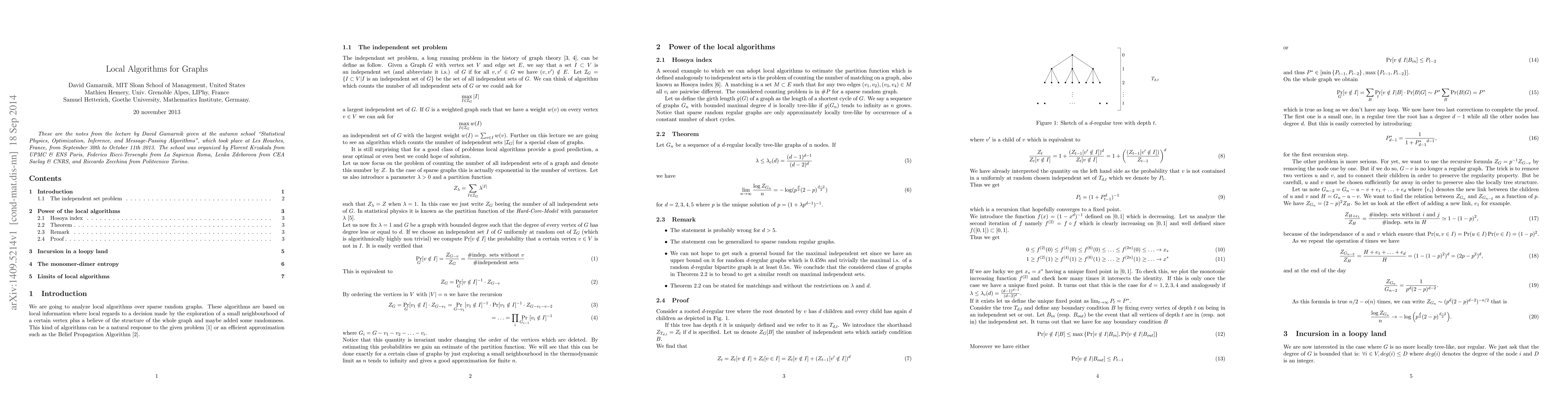 Summary: This paper explores local algorithms for sparse random graphs, which utilize limited neighborhood information and global graph structure beliefs, often incorporating randomness, to provide efficient solutions or approximations, exemplified by the Belief Propagation Algorithm.