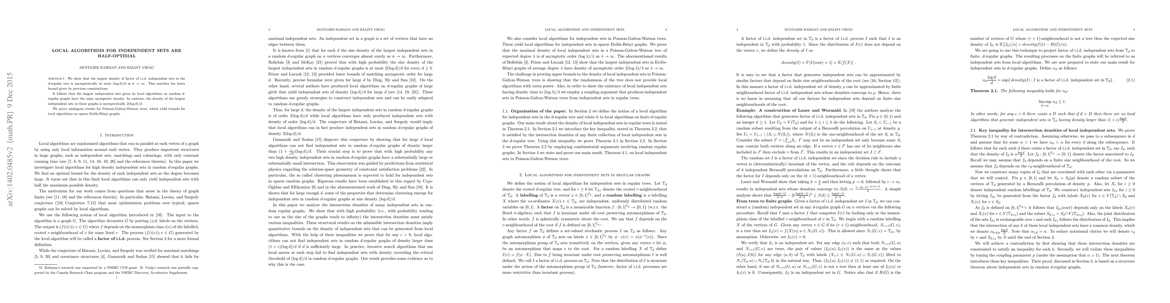 The paper demonstrates that local algorithms for finding independent sets on d-regular trees yield sets with an asymptotic density of (log d)/d, matching the lower bound. This contrasts with the asymptotically higher density of 2(log d)/d for independent sets in these graphs.