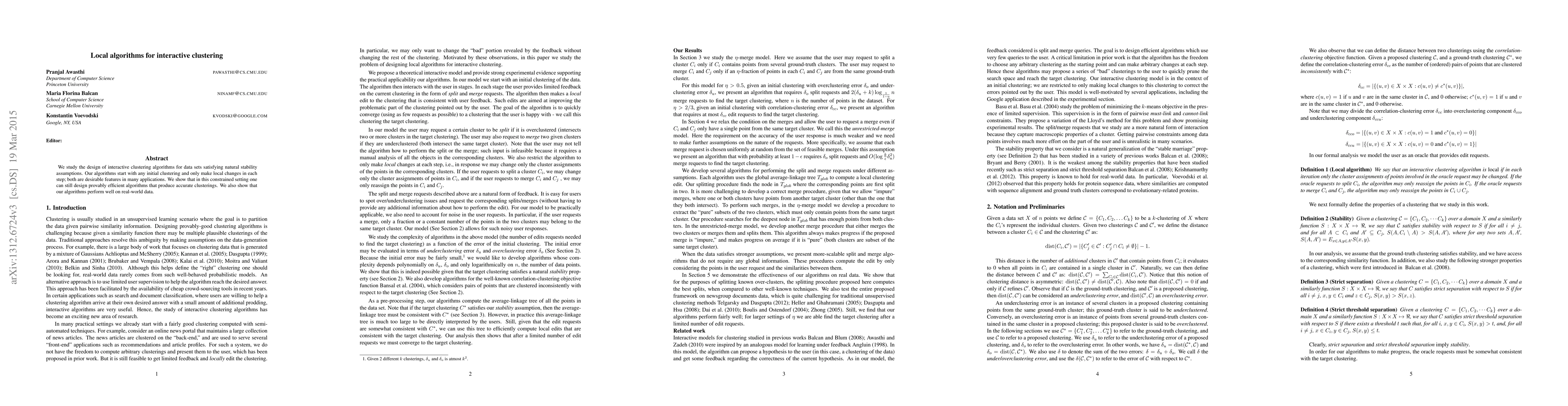This paper proposes interactive clustering algorithms that make local changes to initial clusters, demonstrating their efficiency and accuracy under natural stability assumptions. The algorithms also show good performance on real-world datasets.