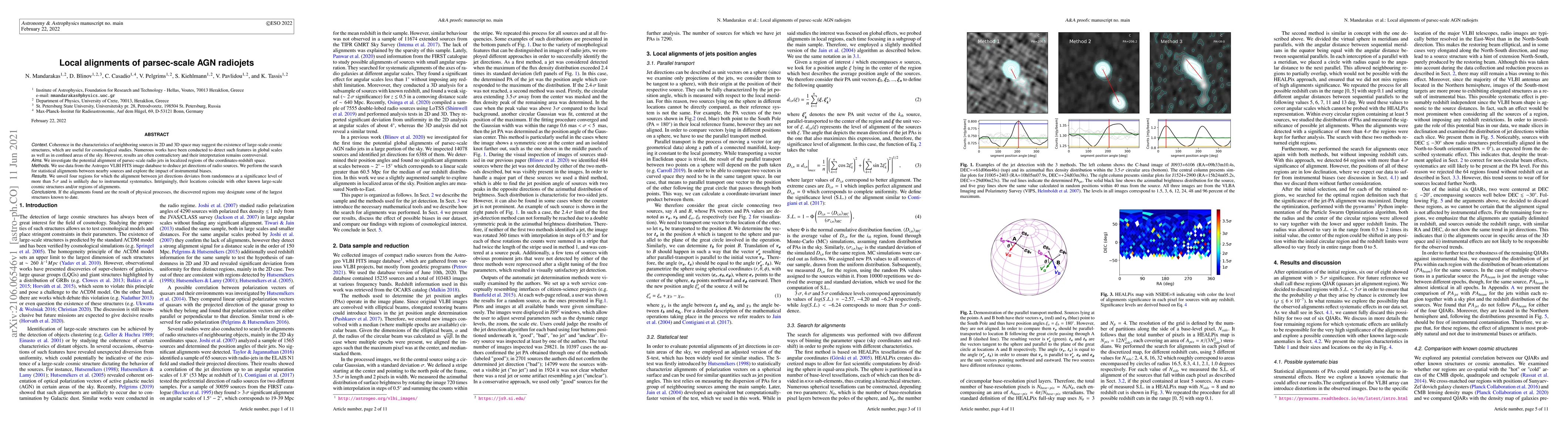 This study investigates the alignment of parsec-scale AGN radio jets in localized regions, revealing four regions with significant non-random alignments that coincide with known large-scale cosmic structures, suggesting the presence of some of the largest cosmic structures. The findings challenge previous contradictory results and highlight the potential for further cosmological studies.