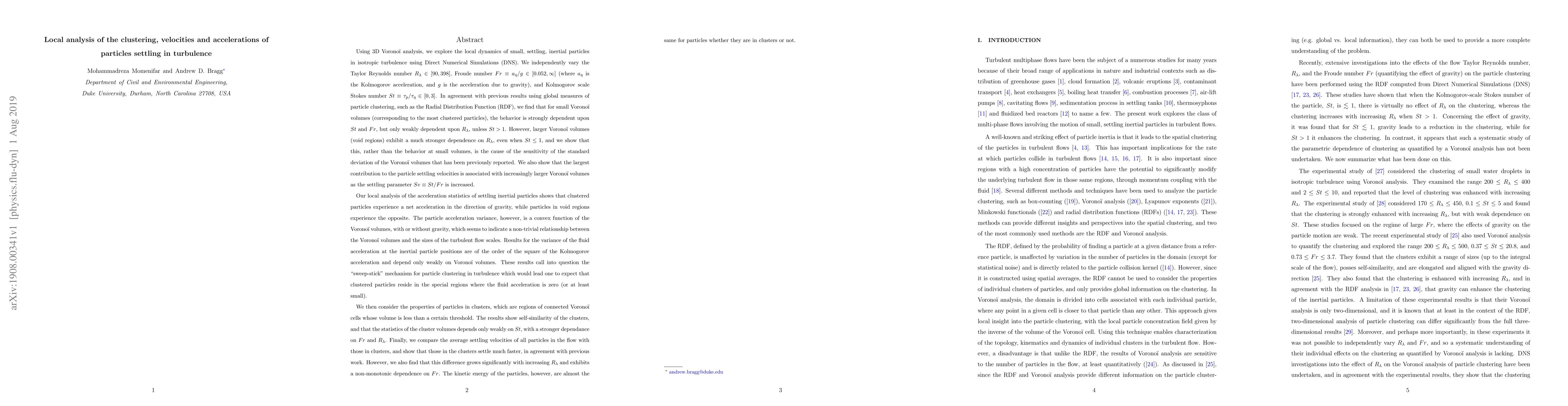 Using 3D Vorono\text{\"i} analysis, we explore the local dynamics of small, settling, inertial particles in isotropic turbulence using Direct Numerical Simulations (DNS). We independently vary the Taylor Reynolds number $R_\lambda \in[90,398]$, Froude number $Fr\equiv a_\eta/g\in[0.052,\infty]$ (where $a_\eta$ is the Kolmogorov acceleration, and $g$ is the acceleration due to gravity), and Kolmogorov scale Stokes number $St\equiv\tau_p/\tau_\eta\in[0,3]$. In agreement with previous results using global measures of particle clustering, such as the Radial Distribution Function (RDF), we find that for small Vorono\text{\"i} volumes (corresponding to the most clustered particles), the behavior is strongly dependent upon $St$ and $Fr$, but only weakly dependent upon $R_\lambda$, unless $St>1$. However, larger Vorono\text{\"i} volumes (void regions) exhibit a much stronger dependence on $R_\lambda$, even when $St\leq 1$, and we show that this, rather than the behavior at small volumes, is the cause of the sensitivity of the standard deviation of the Vorono\text{\"i} volumes that has been previously reported. We also show that the largest contribution to the particle settling velocities is associated with increasingly larger Vorono\text{\"i} volumes as the settling parameter $Sv\equiv St/Fr$ is increased. Our local analysis of the acceleration statistics of settling inertial particles shows that clustered particles experience a net acceleration in the direction of gravity, while particles in void regions experience the opposite. The particle acceleration variance, however, is a convex function of the Vorono\text{\"i} volumes, with or without gravity, which seems to indicate a non-trivial relationship between the Vorono\text{\"i} volumes and the sizes of the turbulent flow scales. Results for the variance of the fluid acceleration at the inertial particle "..."