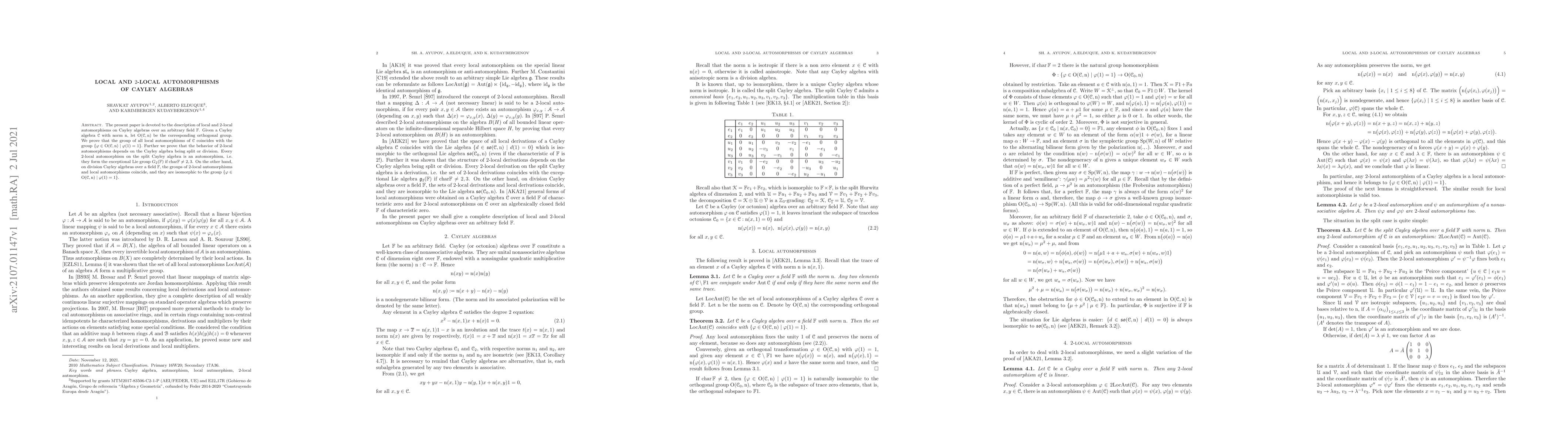 This paper investigates local and 2-local automorphisms of Cayley algebras over arbitrary fields. It establishes that local automorphisms coincide with a specific subset of the orthogonal group fixing the identity, while 2-local automorphisms behave differently based on whether the Cayley algebra is split or a division algebra.