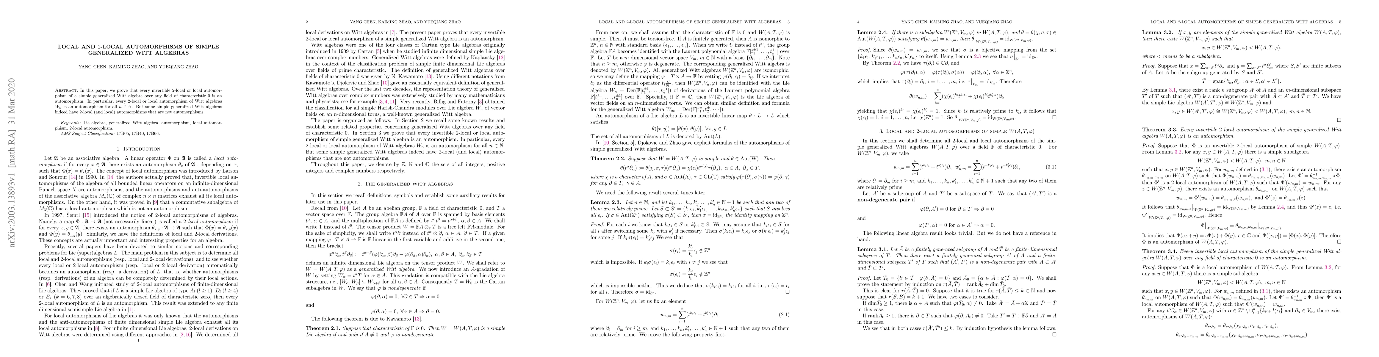 This paper demonstrates that invertible 2-local and local automorphisms of simple generalized Witt algebras over fields of characteristic 0 are global automorphisms. However, it also highlights that some simple generalized Witt algebras possess 2-local and local automorphisms that do not qualify as global automorphisms.