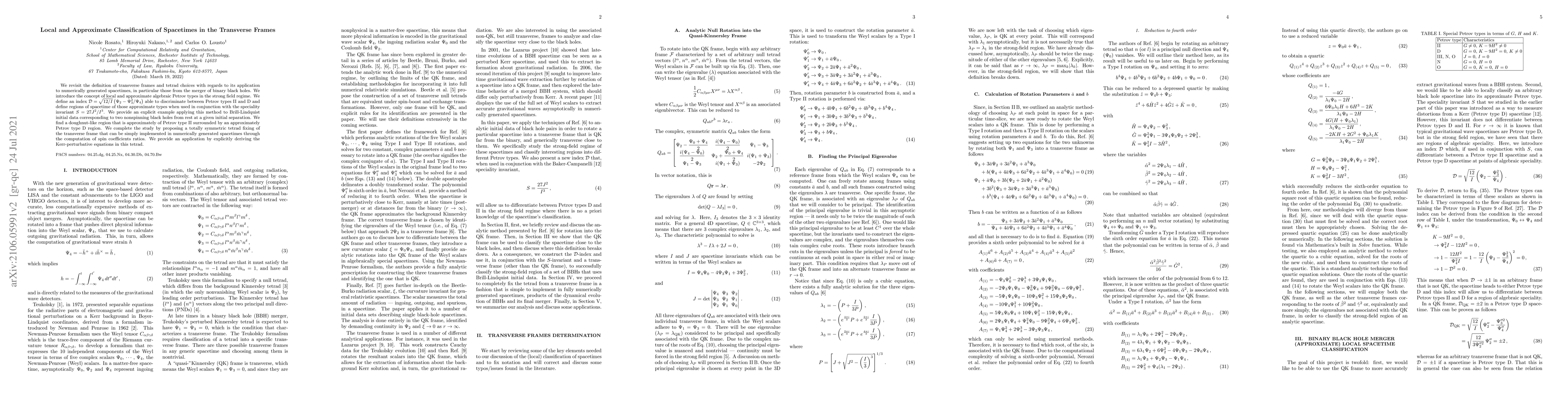 We revisit the definition of transverse frames and tetrad choices with regards to its application to numerically generated spacetimes, in particular those from the merger of binary black holes. We introduce the concept of local and approximate algebraic Petrov types in the strong field regime. We define an index $\mathcal{D}=\sqrt{12/I}\left(\Psi_2 - \Psi_3^2/\Psi_4\right)$ able to discriminate between Petrov types II and D and define regions of spacetime of those approximate types when used in conjunction with the speciality invariant $S=27J^2/I^3$. We provide an explicit example applying this method to Brill-Lindquist initial data corresponding to two nonspinning black holes from rest at a given initial separation. We find a doughnut-like region that is approximately of Petrov type II surrounded by an approximately Petrov type D region. We complete the study by proposing a totally symmetric tetrad fixing of the transverse frame that can be simply implemented in numerically generated spacetimes through the computation of spin coefficients ratios. We provide an application by explicitly deriving the Kerr-perturbative equations in this tetrad.