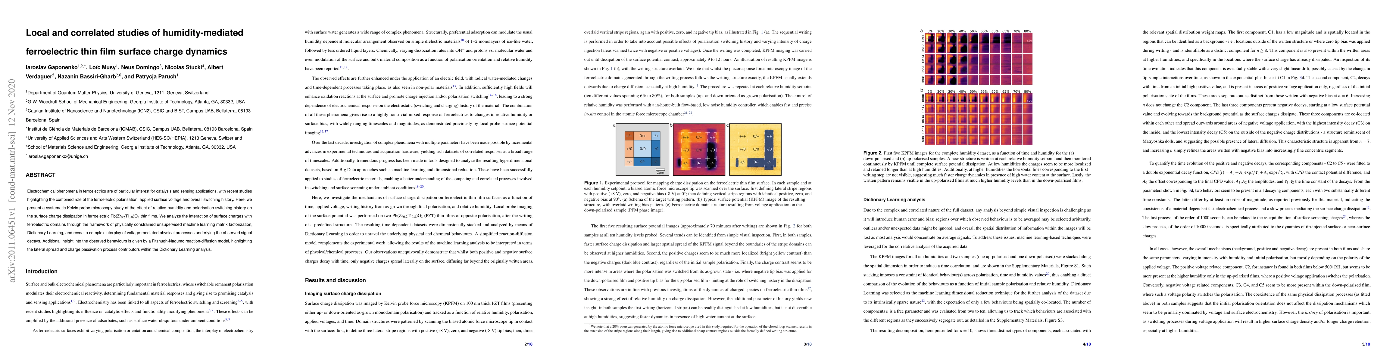 This study investigates how humidity affects the surface charge of ferroelectric thin films and reveals a complex interplay between voltage-mediated physical processes. It uses machine learning and a reaction-diffusion model to analyze the interaction between surface charges and ferroelectric domains.