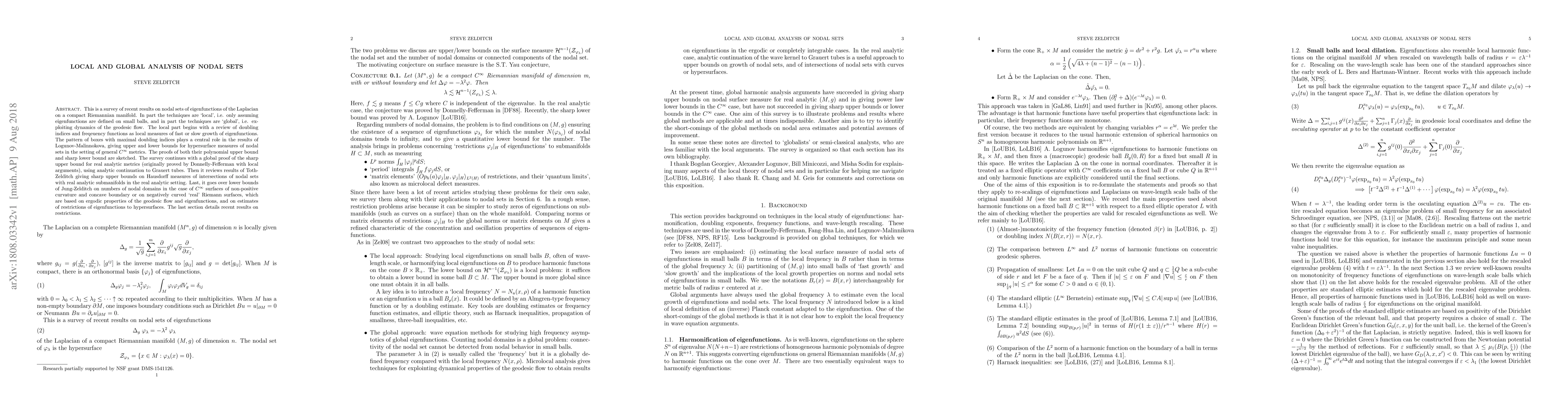 This is a survey for the JDG 50th Anniversary conference of recent results on nodal sets of eigenfunctions of the Laplacian on a compact Riemannian manifold. In part the techniques are `local', i.e. only assuming eigenfunctions are defined on small balls, and in part the techniques are `global', i.e. exploiting dynamics of the geodesic flow. The local part begins with a review of doubling indices and freqeuency functions as local measures of fast or slow growth of eigenfunctions. The pattern of boxes with maximal doubling indices plays a central role in the results of Logunov-Malinnokova, giving upper and lower bounds for hypersurface measures of nodal sets in the setting of general $C^{\infty}$ metrics. The proofs of both their polynomial upper bound and sharp lower bound are sketched. The survey continues with a global proof of the sharp upper bound for real analytic metrics (originally proved by Donnelly-Fefferman with local arguments), using analytic continuation to Grauert tubes. Then it reviews results of Toth-Zelditch giving sharp upper bounds on Hausdorff measures of intersections of nodal sets with real analytic submanifolds in the real analytic setting. Last, it goes over lower bounds of Jung-Zelditch on numbers of nodal domains in the case of $C^{\infty}$ surfaces of non-positive curvature and concave boundary or on negatively curved `real' Riemann surfaces, which are based on ergodic properties of the geodesic flow and eigenfunctions, and on estimates of restrictions of eigenfunctions to hypersurfaces. The last section details recent results on restrictions.