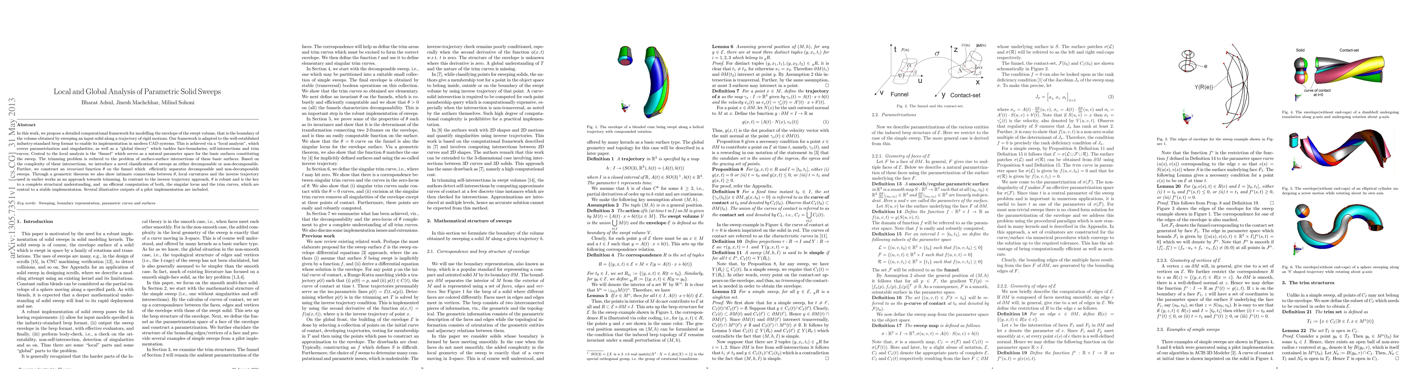 In this work, we propose a detailed computational framework for modelling the envelope of the swept volume, that is the boundary of the volume obtained by sweeping an input solid along a trajectory of rigid motions. Our framework is adapted to the well-established industry-standard brep format to enable its implementation in modern CAD systems. This is achieved via a "local analysis", which covers parametrization and singularities, as well as a "global theory" which tackles face-boundaries, self-intersections and trim curves. Central to the local analysis is the "funnel" which serves as a natural parameter space for the basic surfaces constituting the sweep. The trimming problem is reduced to the problem of surface-surface intersections of these basic surfaces. Based on the complexity of these intersections, we introduce a novel classification of sweeps as either decomposable or non-decomposable. Further, we construct an {\em invariant} function $\theta$ on the funnel which efficiently separates decomposable and non-decomposable sweeps. Through a geometric theorem we also show intimate connections between $\theta$, local curvatures and the inverse trajectory used in earlier works as an approach towards trimming. In contrast to the inverse trajectory approach, $\theta$ is robust and is the key to a complete structural understanding, and an efficient computation of both, the singular locus and the trim curves, which are central to a stable implementation. Several illustrative outputs of a pilot implementation are included.