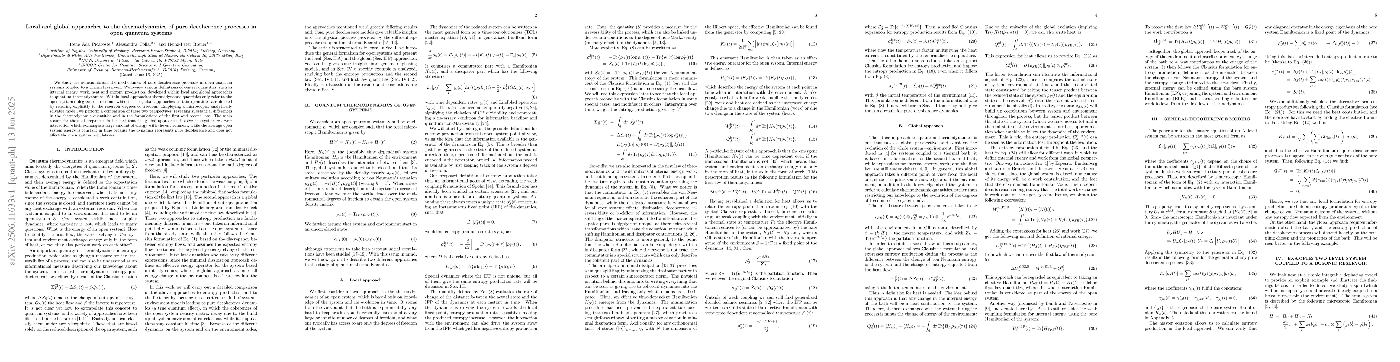 This research compares local and global approaches to quantum thermodynamics in open systems undergoing pure decoherence. It reveals significant differences in thermodynamic quantities and first/second law formulations due to the global approaches considering system-reservoir interactions, unlike local approaches which focus solely on open system degrees of freedom.