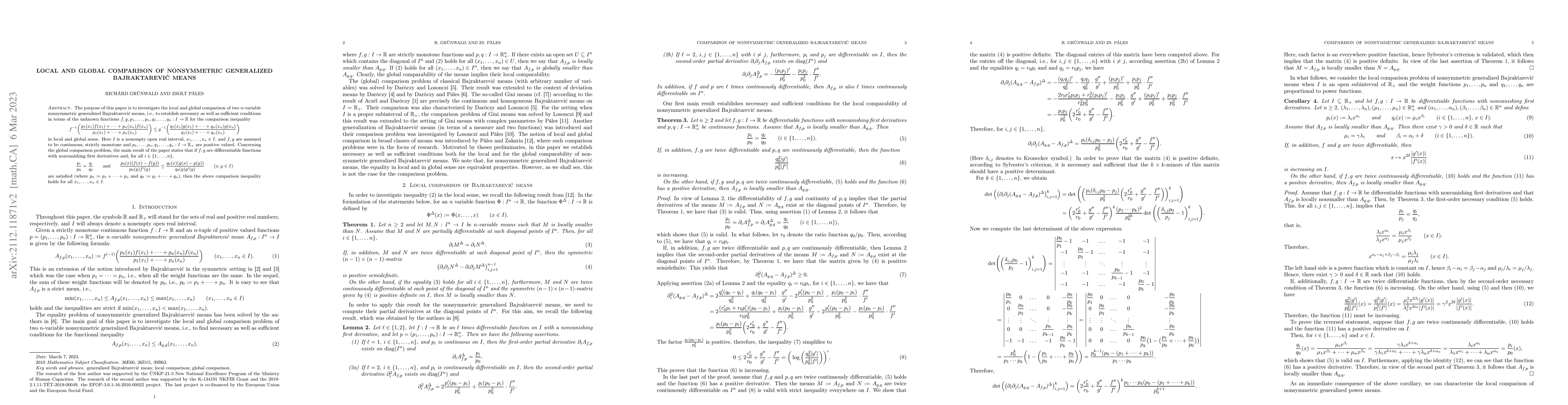 This paper investigates local and global comparisons of two generalized Bajraktarević means, establishing conditions under which the inequality holds. The main result provides sufficient conditions for the global comparison inequality to hold when functions \(f\) and \(g\) are differentiable and satisfy specific derivative-related inequalities.