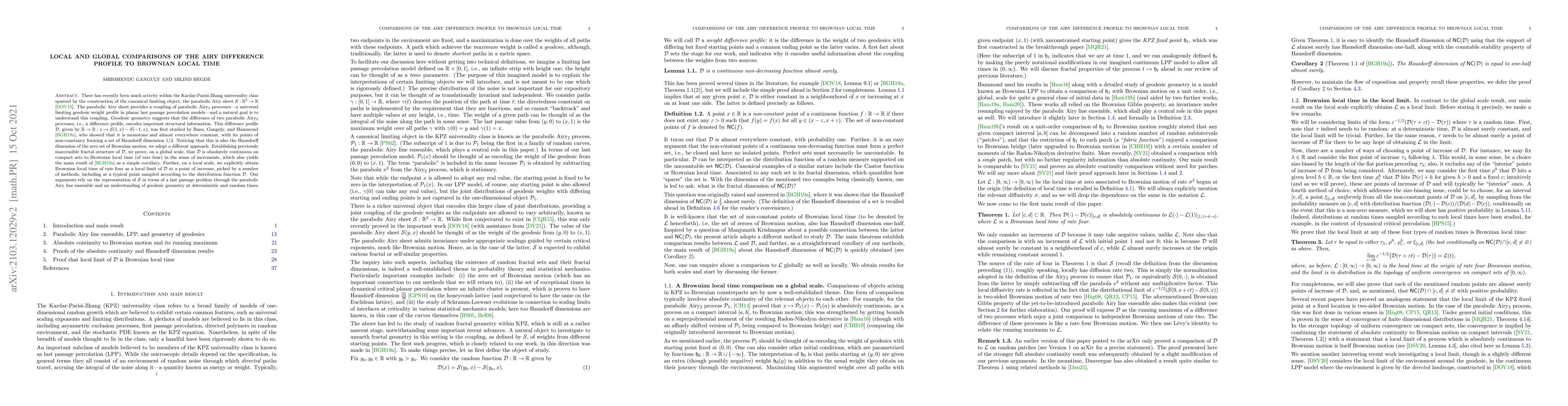 There has recently been much activity within the Kardar-Parisi-Zhang universality class spurred by the construction of the canonical limiting object, the parabolic Airy sheet $\mathcal{S}:\mathbb{R}^2\to\mathbb{R}$ [arXiv:1812.00309]. The parabolic Airy sheet provides a coupling of parabolic Airy$_2$ processes -- a universal limiting geodesic weight profile in planar last passage percolation models -- and a natural goal is to understand this coupling. Geodesic geometry suggests that the difference of two parabolic Airy$_2$ processes, i.e., a difference profile, encodes important structural information. This difference profile $\mathcal{D}$, given by $\mathbb{R}\to\mathbb{R}:x\mapsto \mathcal{S}(1,x)-\mathcal{S}(-1,x)$, was first studied by Basu, Ganguly, and Hammond [arXiv:1904.01717], who showed that it is monotone and almost everywhere constant, with its points of non-constancy forming a set of Hausdorff dimension $1/2$. Noticing that this is also the Hausdorff dimension of the zero set of Brownian motion, we adopt a different approach. Establishing previously inaccessible fractal structure of $\mathcal{D}$, we prove, on a global scale, that $\mathcal{D}$ is absolutely continuous on compact sets to Brownian local time (of rate four) in the sense of increments, which also yields the main result of [arXiv:1904.01717] as a simple corollary. Further, on a local scale, we explicitly obtain Brownian local time of rate four as a local limit of $\mathcal{D}$ at a point of increase, picked by a number of methods, including at a typical point sampled according to the distribution function $\mathcal{D}$. Our arguments rely on the representation of $\mathcal{S}$ in terms of a last passage problem through the parabolic Airy line ensemble and an understanding of geodesic geometry at deterministic and random times.