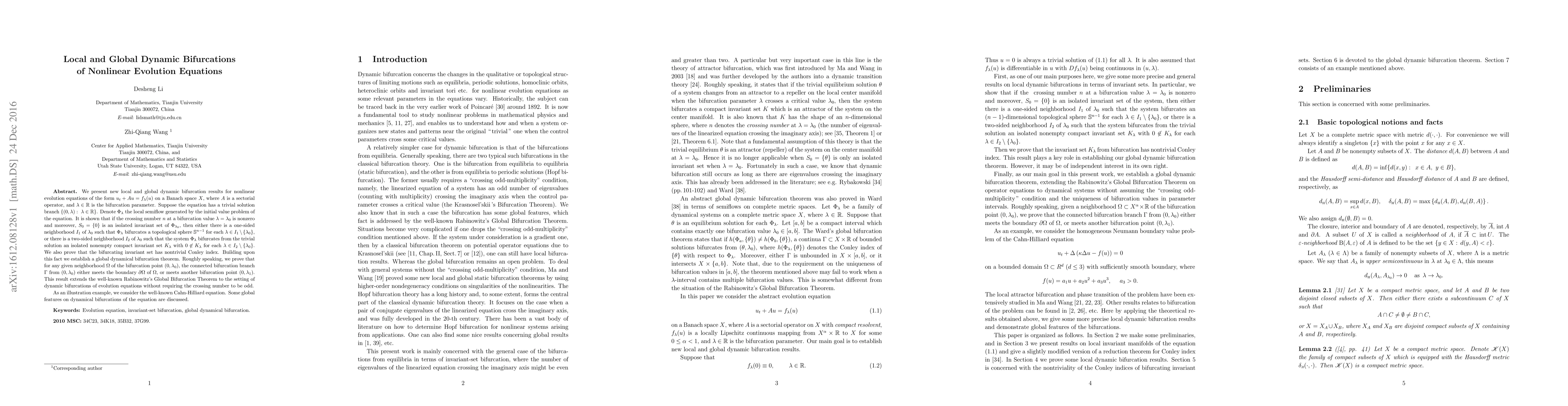 This paper presents new local and global bifurcation results for nonlinear evolution equations, showing that bifurcations can lead to topological spheres or isolated invariant sets. The study extends Rabinowitz's Global Bifurcation Theorem to dynamic bifurcations without requiring the crossing number to be odd, and an example using the Cahn-Hilliard equation is provided.