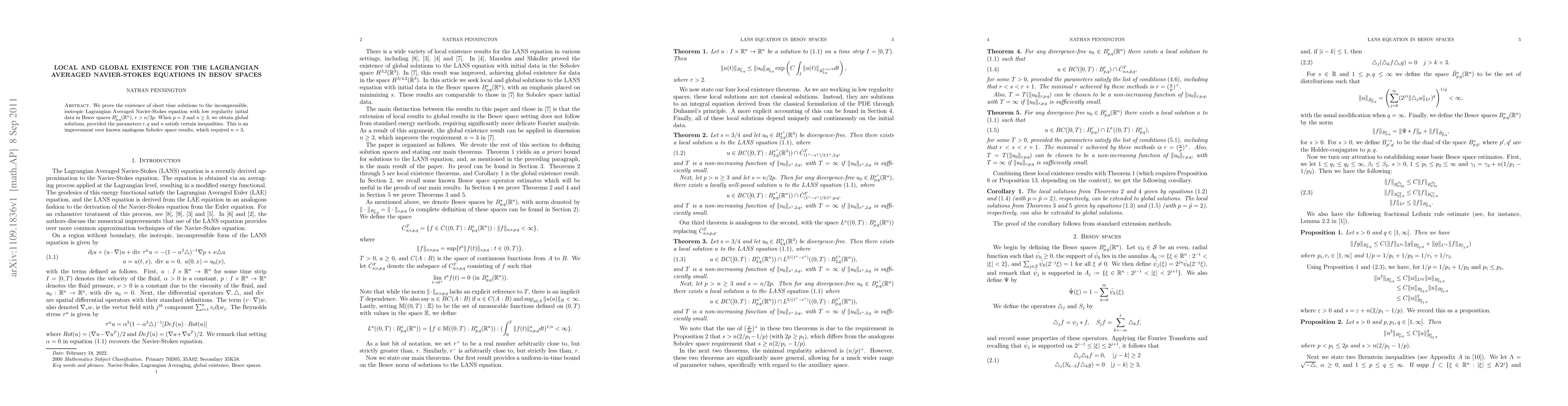 This paper establishes short-time local and global existence for the Lagrangian Averaged Navier-Stokes equations in Besov spaces, improving upon previous Sobolev space results by relaxing the dimension requirement from $n=3$ to $n\geq 3$ when $p=2$.