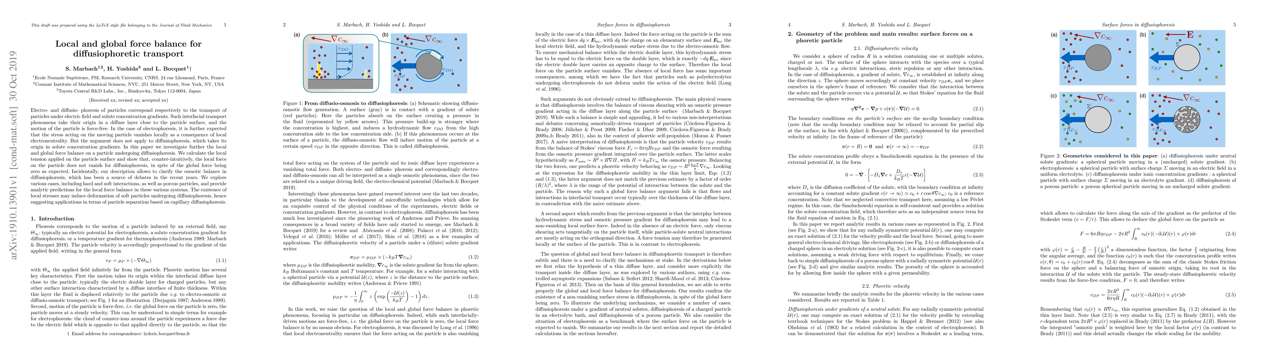 Electro- and diffusio- phoresis of particles correspond respectively to the transport of particles under electric field and solute concentration gradients. Such interfacial transport phenomena take their origin in a diffuse layer close to the particle surface, and the motion of the particle is force-free. In the case of electrophoresis, it is further expected that the stress acting on the moving particle vanishes locally as a consequence of local electroneutrality. But the argument does not apply to diffusiophoresis, which takes its origin in solute concentration gradients. In this paper we investigate further the local and global force balance on a particle undergoing diffusiophoresis. We calculate the local tension applied on the particle surface and show that, counter-intuitively, the local force on the particle does not vanish for diffusiophoresis, in spite of the global force being zero as expected. Incidentally, our description allows to clarify the osmotic balance in diffusiophoresis, which has been a source of debates in the recent years. We explore various cases, including hard and soft interactions, as well as porous particles, and provide analytic predictions for the local force balance in these various systems. The existence of local stresses may induce deformation of soft particles undergoing diffusiophoresis, hence suggesting applications in terms of particle separation based on capillary diffusiophoresis.
