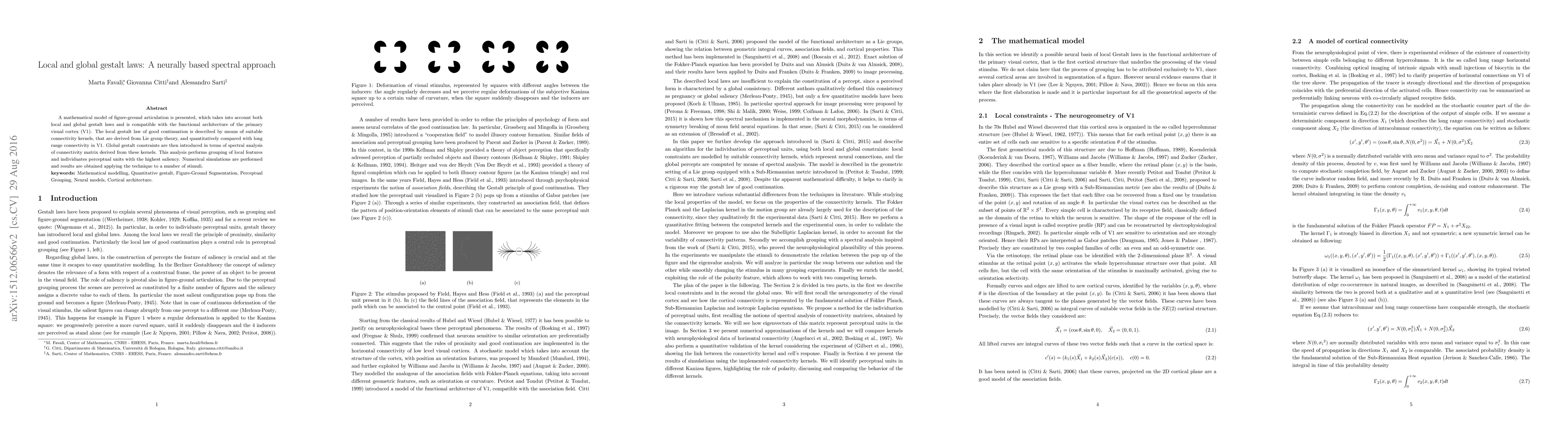 This research introduces a mathematical model for figure-ground perception, integrating local and global gestalt laws. The model aligns with V1's visual cortex architecture, using connectivity kernels from Lie group theory to describe local continuity. Global constraints are applied via spectral analysis of connectivity matrices, enabling saliency-based feature grouping and perceptual unit identification. Numerical simulations validate the approach with diverse stimuli.