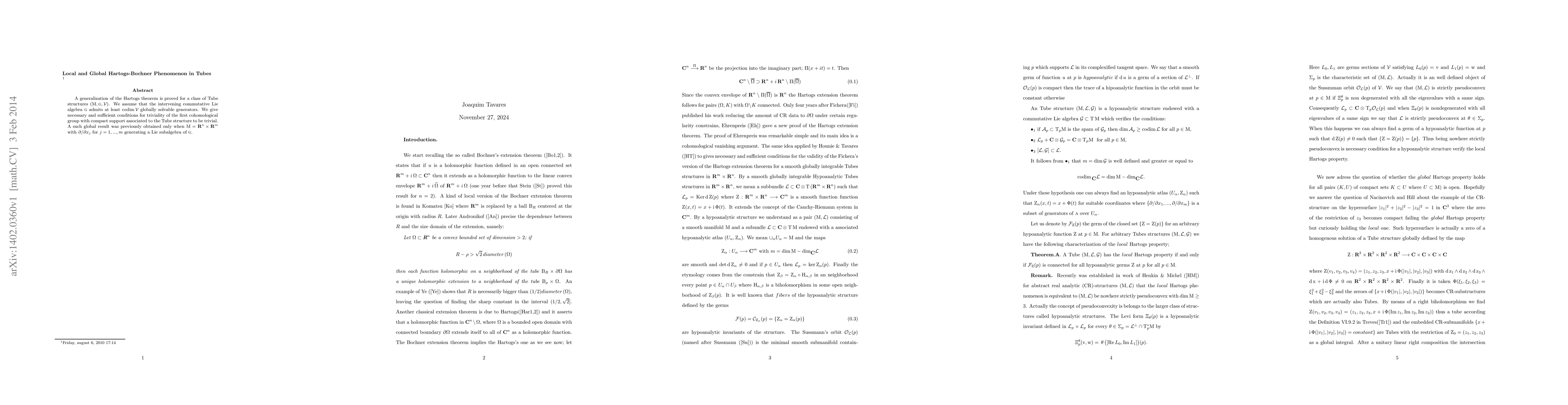 A generalization of the Hartogs theorem is proved for a class of Tubes structures. We assume that the intervening commutative Lie algebra admits at least a number of globally solvable generators greater or equal to the structure codimension. We give necessary and sufficient conditions for the first cohomological group with compact support to be trivial. A such global result was previously obtained only when the supporting manifold was the Euclidean space. Further but canonical work is need to recover the Bochner extension theorem.