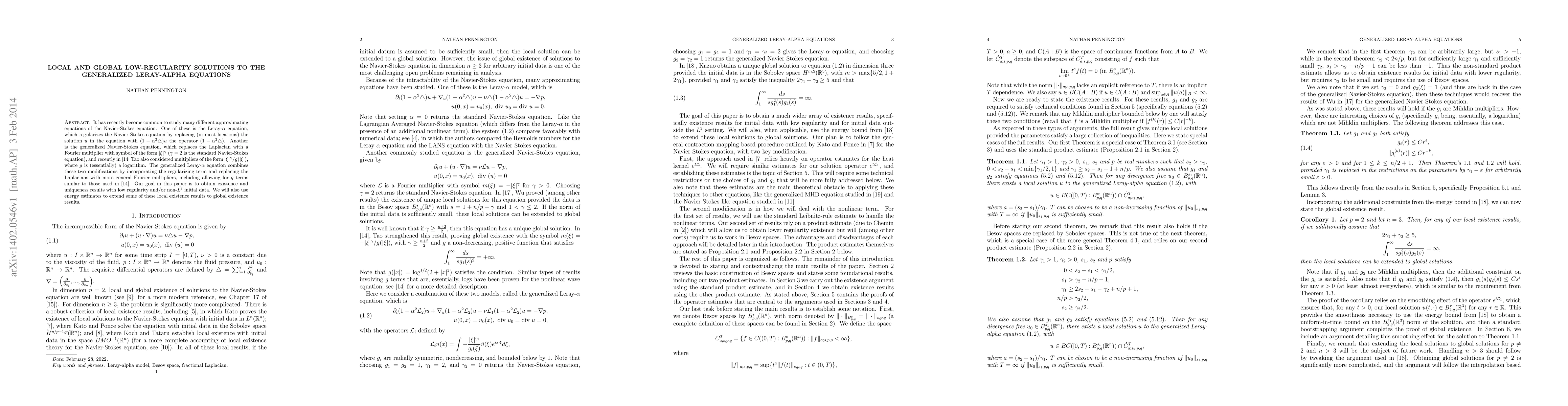 It has recently become common to study many different approximating equations of the Navier-Stokes equation. One of these is the Leray-$\alpha$ equation, which regularizes the Navier-Stokes equation by replacing (in most locations) the solution $u$ in the equation with $(1-\alpha^2\triangle)u$ the operator $(1-\alpha^2\triangle)$. Another is the generalized Navier-Stokes equation, which replaces the Laplacian with a Fourier multiplier with symbol of the form $|\xi|^\gamma$ ($\gamma=2$ is the standard Navier-Stokes equation), and recently in [14] Tao also considered multipliers of the form $|\xi|^\gamma/g(|\xi|)$, where $g$ is (essentially) a logarithm. The generalized Leray-$\alpha$ equation combines these two modifications by incorporating the regularizing term and replacing the Laplacians with more general Fourier multipliers, including allowing for $g$ terms similar to those used in [14]. Our goal in this paper is to obtain existence and uniqueness results with low regularity and/or non-$L^2$ initial data. We will also use energy estimates to extend some of these local existence results to global existence results.