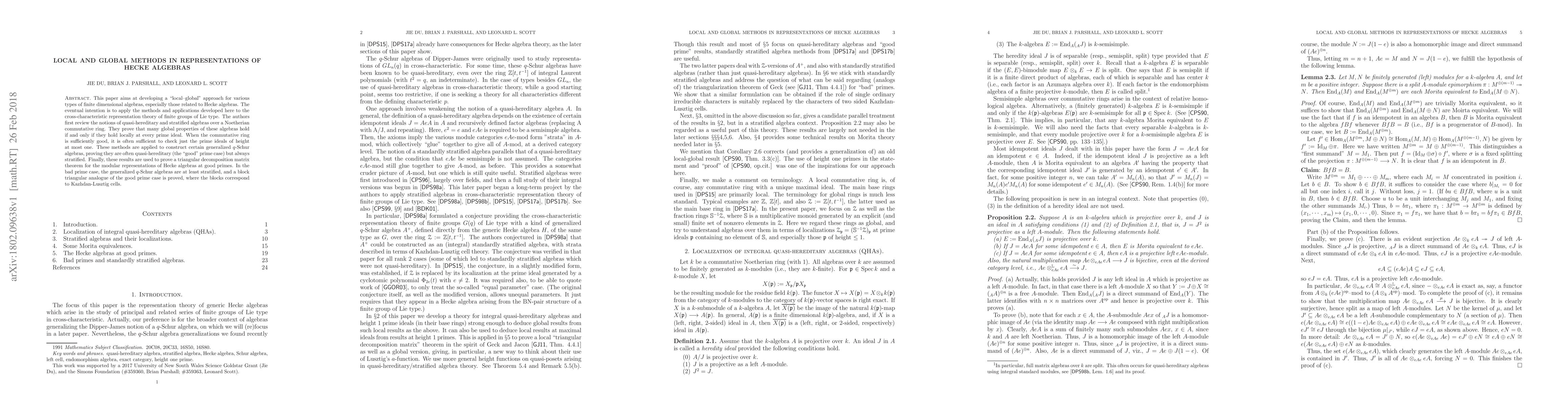 This paper develops a local-global approach for finite dimensional algebras, particularly Hecke algebras, showing that many global properties can be verified locally. It constructs generalized q-Schur algebras and proves their quasi-hereditary nature at good primes, leading to a triangular decomposition matrix theorem for modular representations.