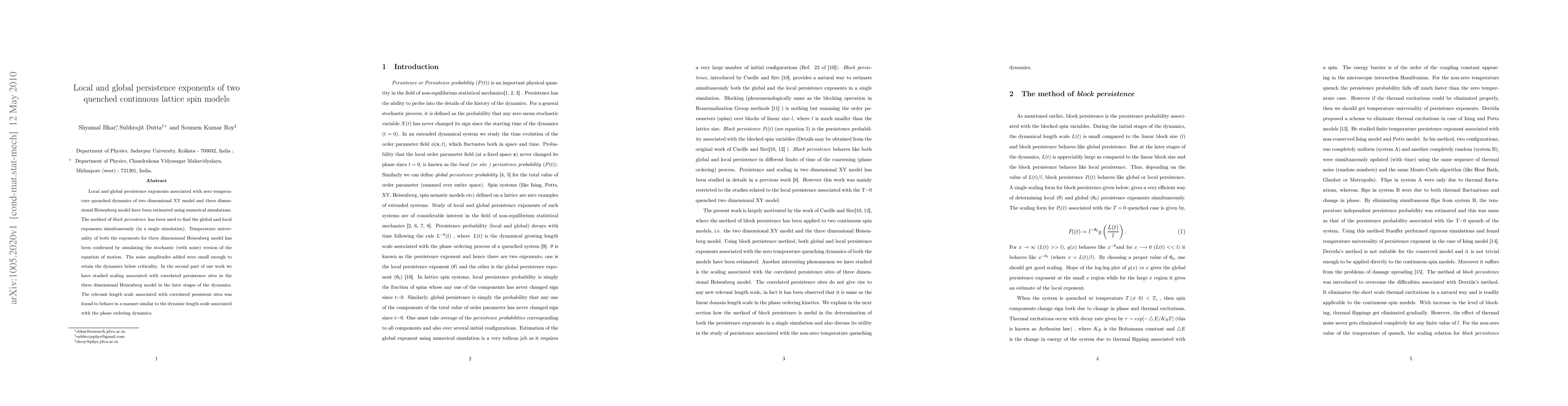 This paper estimates local and global persistence exponents in two-dimensional XY and three-dimensional Heisenberg models using numerical simulations, confirming temperature universality for the latter. It also investigates scaling behavior and correlated persistence sites in the three-dimensional Heisenberg model, finding a similarity to the dynamic length scale of phase ordering.