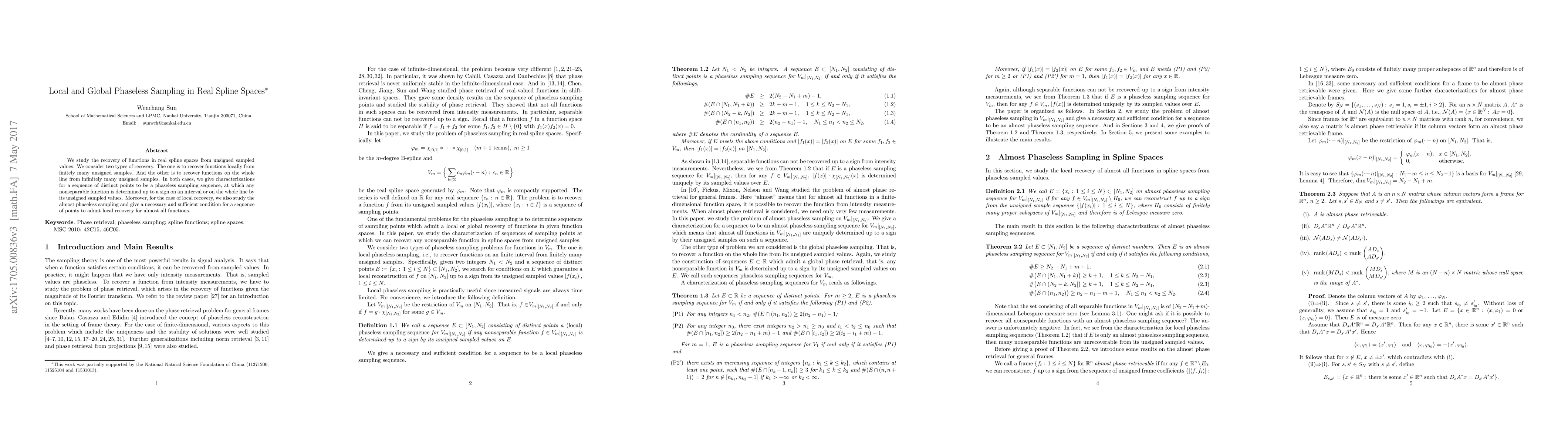 This paper explores the recovery of functions from unsigned samples in real spline spaces, focusing on both local and global phaseless sampling. It provides characterizations for sequences that allow function recovery up to a sign, and also addresses almost phaseless sampling for local recovery.